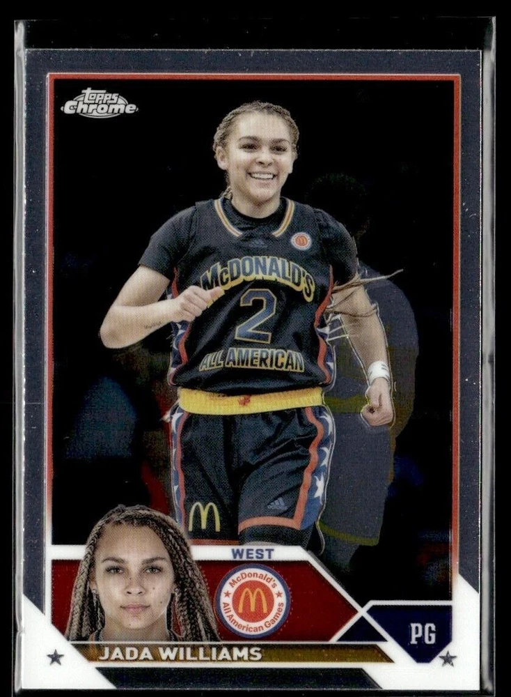 Character: Jada Williams Sport: Basketball Graded: No Player/Athlete: Jada Williams Season: 2023 Game: Unspecified Card Number: 46 Type: Sports Trading Card Franchise: Basketball Vintage: No Original/Licensed Reprint: Original Set: Topps Chrome Team: McDonald's All American Card Size: 3¾" x 2¾" Year Manufactured: 2023 Autographed: No Card Name: 2023-24 TOPPS CHROME JADA WILLIAMS MCDONALD'S ALL AMERICAN #46 Manufacturer: Topps