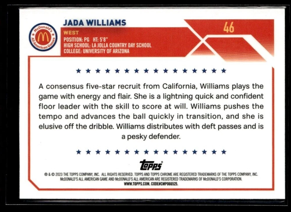 2023-24 TOPPS CHROME JADA WILLIAMS MCDONALD'S ALL AMERICAN #46