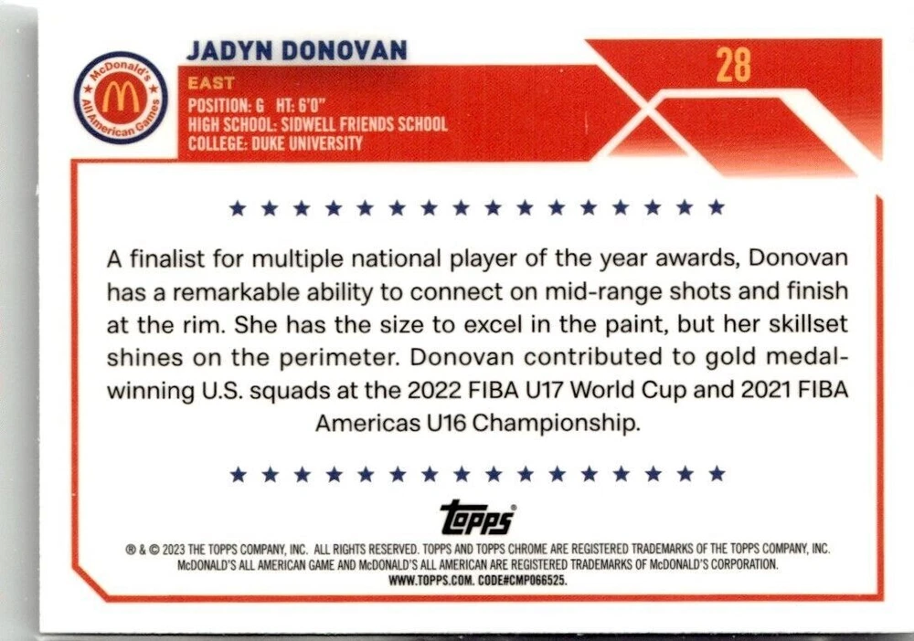 2023-24 TOPPS CHROME MCDONALD'S ALL AMERICAN JADYN DONOVAN DUKE UNIVERSITY #28