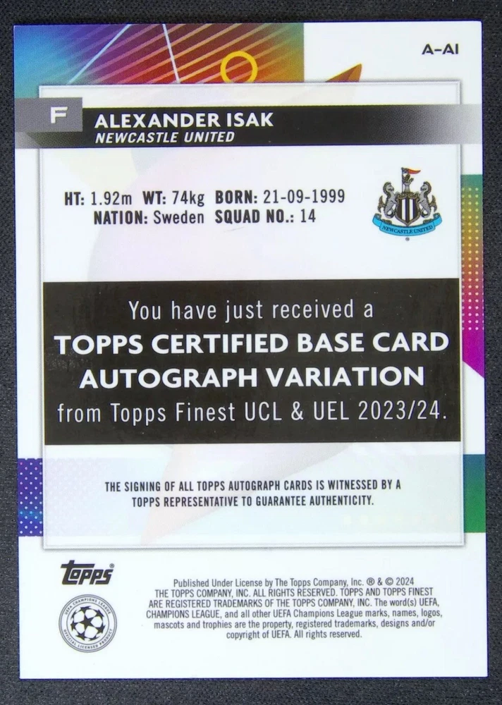 Parallel/Variety: Blue Refractor Sport: Soccer Set: 2023-24 Topps Finest Season: 2023-24 Type: Sports Trading Card Player/Athlete: Alexander Isak