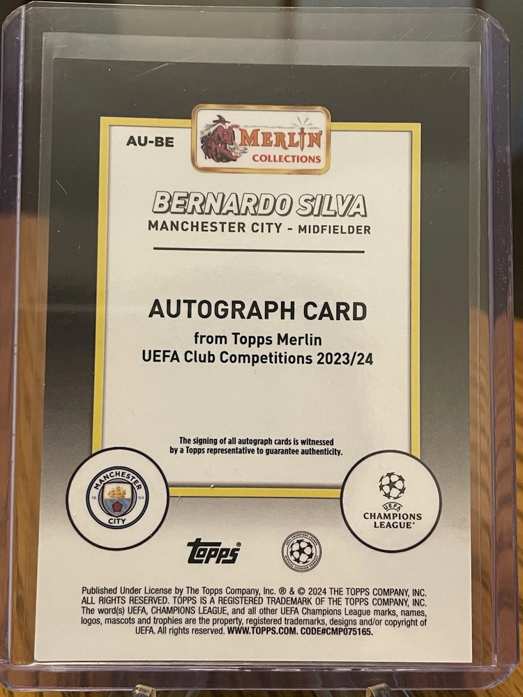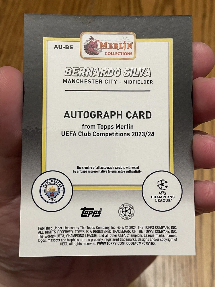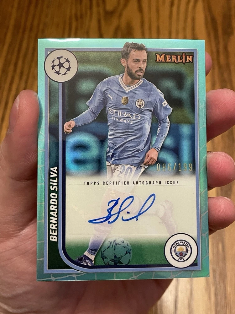 For all the soccer fans out there, a rare 2024 Topps trading card of Manchester City's Bernardo Silva is up for grabs! This autographed card features an Aqua Refractor design and is numbered AU-BE out of 199. It's a must-have for collectors who are looking to add a unique and valuable piece to their collection. This card is an insert in the 2024 Topps set and is perfect for fans of the UEFA Champions League. The card is manufactured by Topps and features Bernardo Silva, a talented player from Manchester City. Don't miss out on this opportunity to own a rare and authentic sports trading card!