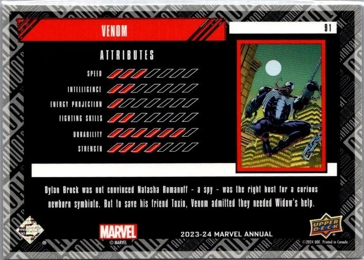 Dive into the Marvel Universe with the 2023-24 UD Marvel Annual VENOM #91 Non-Sport Trading Card. This Upper Deck release captures the essence of the Venom character, offering fans a piece of the Marvel (MCU) franchise. The card belongs to the Marvel Annuals set, featuring the base set design that collectors and enthusiasts have come to appreciate. The trading card is a must-have for enthusiasts of the Venom movie and those who follow the character's adventures in the Marvel comics. With its rich detail and vibrant colors, this card brings the extraterrestrial symbiote to life, making it a standout addition to any Marvel collection.