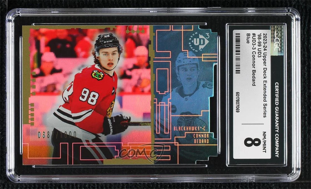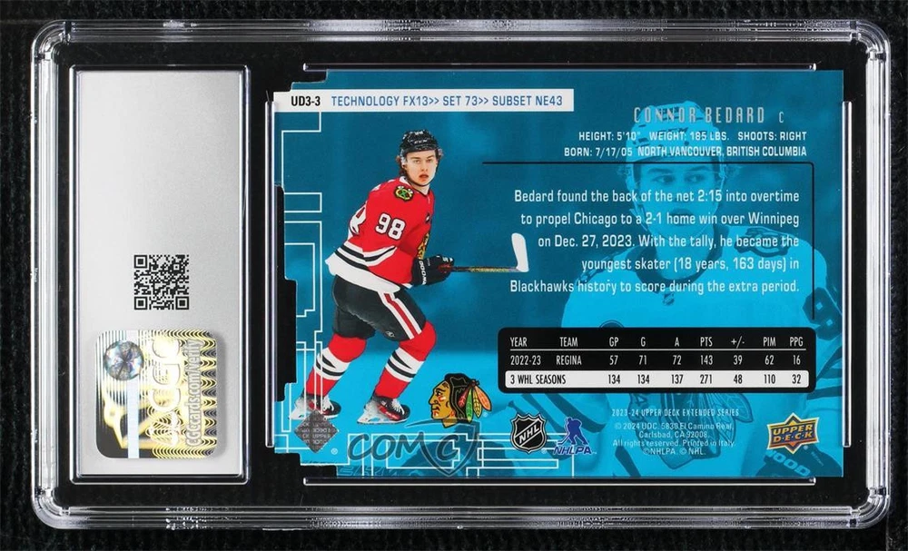 Get your hands on this amazing Connor Bedard 2023-24 Upper Deck Extended Technology FX13 Die Cut Rookie trading card! This limited edition card is one of only 1000 printed, making it a highly sought-after item for collectors and fans alike. Featuring the talented player in his Chicago Blackhawks jersey, this card is a must-have for any ice hockey fan. With its serial number, parallel/variety, and rookie features, this card is sure to be a standout addition to any collection. Don't miss your chance to own a piece of NHL history with this autograph-free card from Upper Deck. UD3-3