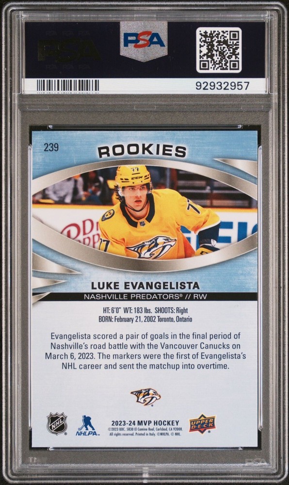 GEM MINT PSA 10 (Short Print Rookie) - Super Low Pop. 2023-24 Upper Deck MVP #239 LUKE EVANGELISTA RC - Predators Rookie RW Well-protected; shipped via USPS Payment/Shipping FAQ: All payments must be made through eBay. Unpaid item cases are opened 4 days after a commitment to purchase has been made. Per eBay policy, making an offer is a commitment to buy, and no orders will be cancelled. For a single US order of multiple items, shipping charges are combined at $0.50 for each additional item unless otherwise stated in the listing. Shipping charges for a single order will not exceed $6.95 for items eligible for combined shipping. For international orders of multiple items, shipping charges are combined (USD $1.00 for each additional item). Thanks for your interest, and be sure to visit our eBay store for more great items!
