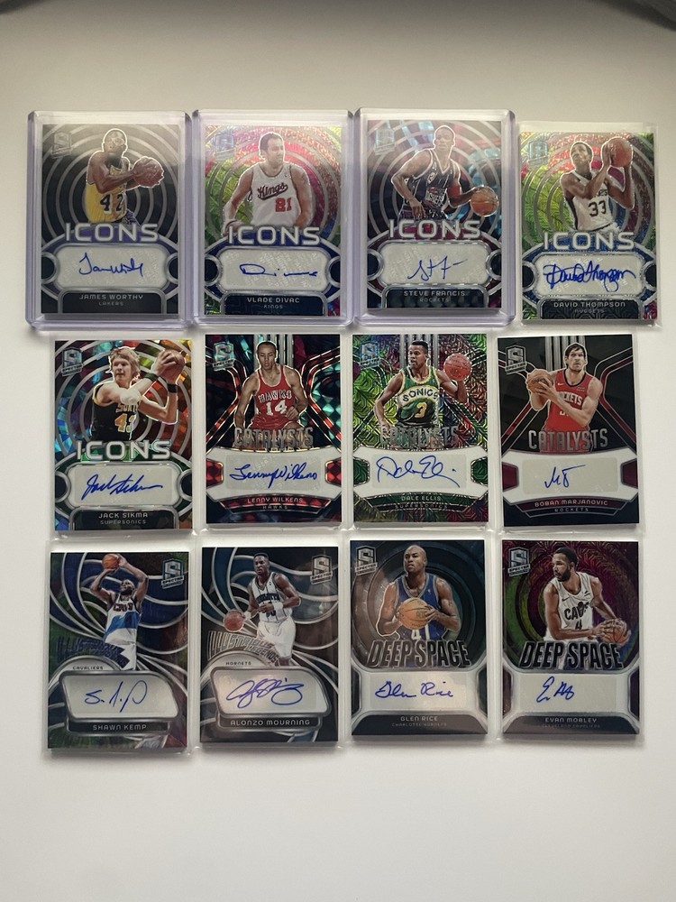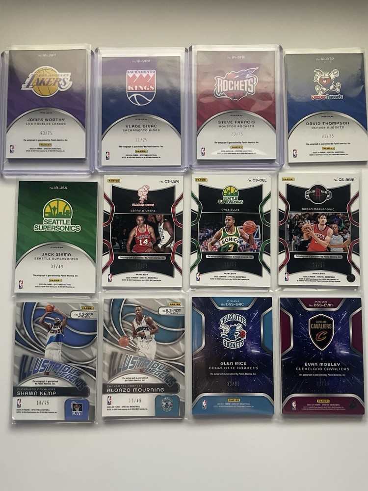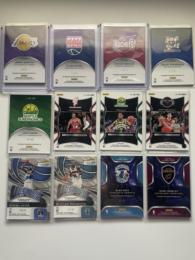 The product is 2023-24 Panini Spectra basketball trading cards featuring autographs. It is manufactured by Panini and is specifically a sports trading cards. The cards are related to basketball and is ideal for collectors or fans of sports trading cards.