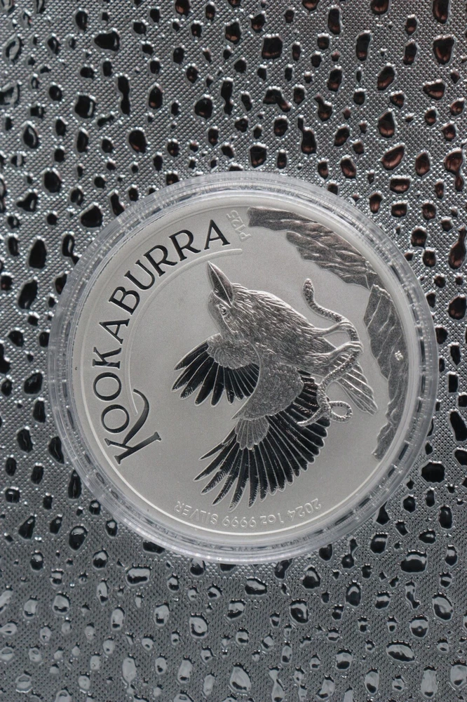 The product is a 2024 Australian Silver Kookaburra coin minted by The Perth Mint. It contains 1 oz of .9999 fine silver. The coin features a business strike type and is ungraded and uncertified. The coin has a face value of $1 and is from the United States.