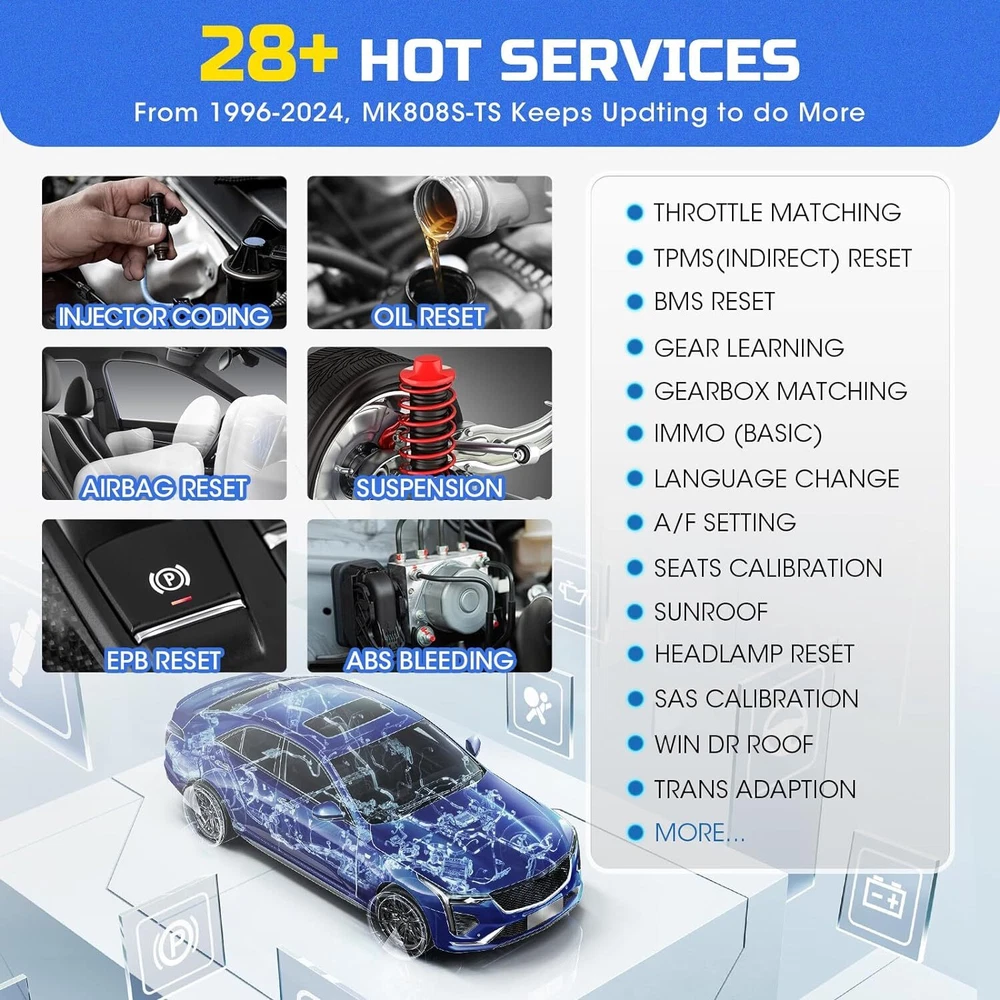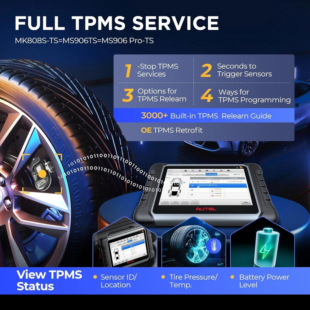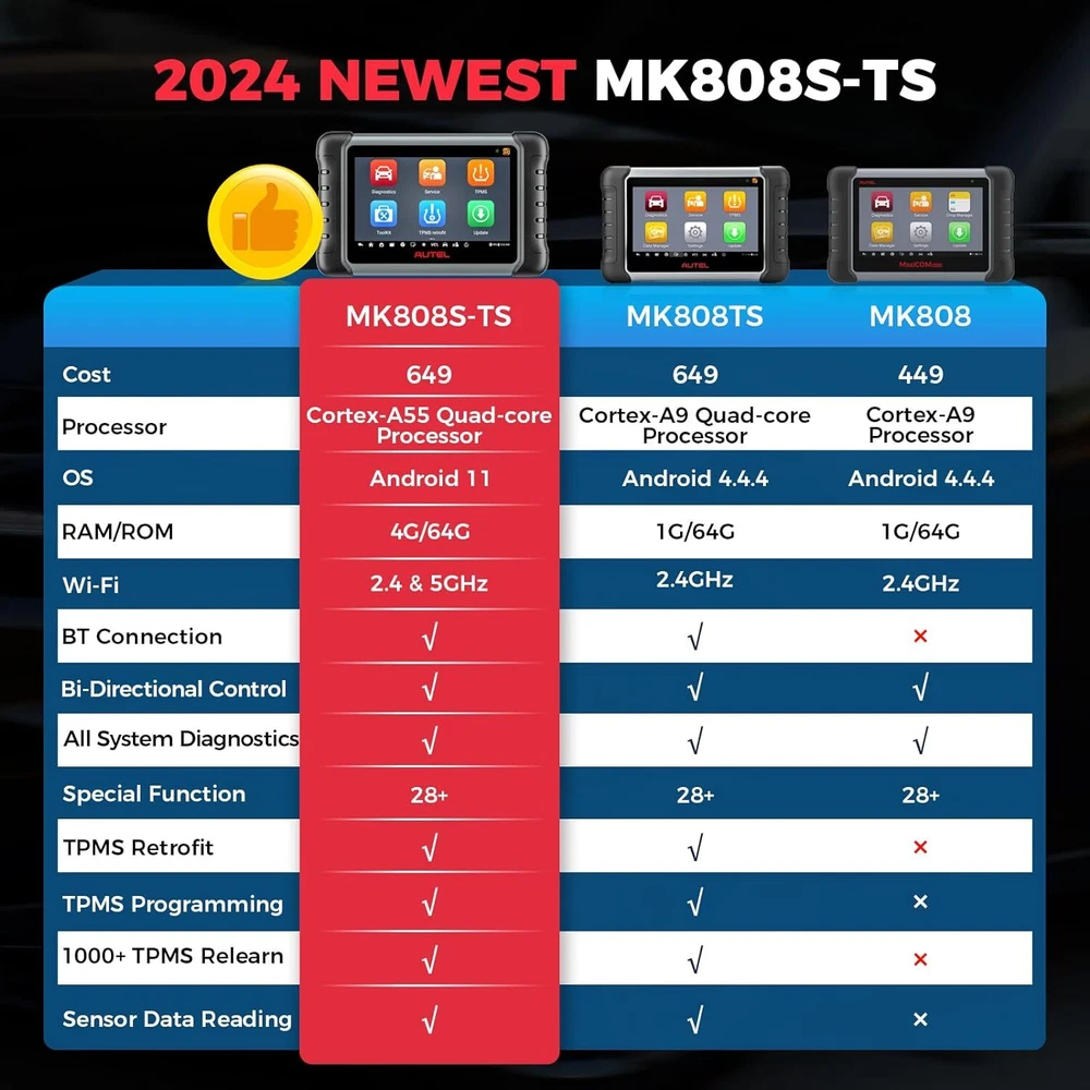 2024 Autel MaxiCOM MK808S-TS Bidirectional & TPMS Programming Diagnostic Scanner Autel MaxiCOM MK808S-TS OBD2 Scanner: 2024 Updated of MK808BT PRO, MK808TS MX808TS TS601 with Bidirectional Test, 28 Service 150 Makes, TPMS Programming Relearn Retrofit, All-System Scan, OS 11 4+64G ✅ Note: This listing has 4 Options which include different items, please make sure the options and items you want to have before order it. Thanks. 💥 Note:Multiple package options,pls choose what you want! Package option 1 : MK808S ($467) Package option 2 : MK808K-BT ($529) Package option 3 : MK808S-TS ($590) Package option 4 : MV105S($45.99) About this item 🎉【 Equals MK808BT PRO +TS608 】Upgraded from MaxiCheck MX808S-TS MK808TS MK808BT PRO, 2024 New Version MaxiCOM MK808S-TS obd2 scanner has highly upgraded its hardware and car coverage at the same cost to offer you smoother diagnostic experience. With powerful ROCKCHIP RK3566 CPU, improved OS Android 11, larger 4GB+64GB, 5G Wi-Fi, fast-running MK808S-TS is equipped with advanced TPMS Function, 28 Service, Active Test, All System Diagnosis for 150 brands to meet all your daily repairing needs. 【 Complete TPMS Diagnosis Plus TPMS Retrofitting 】As the great combo of Maxitpms TS601/TS608/MK808BT PRO, TPMS programming & relearn tool MK808S-TS can perform every aspect of TPMS service: all-known sensors activation; view sensors data, TPMS diagnostics; 4 ways to program Autel MX-Sensor; 3 positions relearn procedures; TPMS retrofit, which can help vehicles without factory-fitted TPMS module or sensors build everything from scratch, allowing you to enjoy worry-free driving. 【 Ground-Breaking Bi-directional Control Scanner 】2024 NEW RELEASE MK808S-TS diagnostic scan tool for all vehicles enjoys the powerful Active Testes, which makes MK808S-TS the most cost-effective bidirectional mechanic tool (Cost less $594 than MP808BT PRO+TS601). Bi-directional Control is widely used on car subsystems to help you check if the car actuators are all in good condition. Such as windows, rear mirrors, sunroof, wipers... 【 28+ Maintenance Service for 150 Brands 】Complete functions & competitive price make the MK808BT enhanced version MK808S-TS stands out in all code readers & scan tools. Updated of MZ808, MX808S-TS, MK808S-TS BT & Wireless auto scan tool has gathered more special functions which are available on wider car coverage from 1996 to 2024. In total over 28+ special functions are the perfect solutions for the daily tune-ups, such as oil reset, EPB, TPMS, BMS, brake bleeding, IMMO, SAS etc. 【 Factory-Level All System Diagnostics 】To root out car problems hidden underneath the hood, Autel scanner MK808S-TS features OE-level full-system diagnostics just as Snap-on scanners but covers more vehicles. MK808TS escaner para auto can dive into every corner of the systems, such as TCM, ECM, EPS, PDM, BCM, etc. to do Read/Clear Codes, ECU info., Live Data, Active Tests, & Special Functions. Also, it presents everything about your ride with a specific report. 【 150+Brands Coverage & Updated Functions】 Bidirectional scanner MK808STS has been further developed with 150+brands coverage & more functions. Its complete TPMS functions & all-system diagnoses all work very well on 150+ car brands (1996-2024). The AutoAuth allows you to diagnose FCA cars after 2018 without a bypass cable. The Renault SGW function unl-ocks Renault’s gateway to perform diagnoses & services. The extended features capture every detail with MV105 & BT506. 【 0-Risk Purchase with Reliable Seller】 As the updated version of MK808BT PRO, MX808S-TS MK808Z-TS, our MK808S-TS works very well on 99% cars with enhanced hardware and more powerful software. As the largest Autel officially certified seller for 8 years, we offers you 1-year warranty & free updates, 24/7 thoughtful support and 30-day refund & exchanges. Product Description 2024 AUTEL MAXICOM MK808S-TS with ENHANCED HARDWARE and SOFTWARE 2024 Autel Newest OE-Level Bidirectional & TPMS Tablet---MaxiCOM MK808S Q: Plz Recommend a Cost-Effective Scanner to Both Professional Mechanics and Tire Shops. A: As the PM of Autel, I would highly recommend MK808S-TS to you. With only 659BUCKS, you can get this amazing device---the combination of MK808S+MK808BT+TS601, featuring both the high-end diagnostic functions and TPMS professional functions together. Q: Why Upgraded the MK808TS to the MK808S-TS? A: For the benefit of consumers, we upgraded the MX808TS & MK808TS to MK808S-TS at the same cost, but added more features & car models. 1. Fully Enhanced Hardware: the more powerful CPU ROCKCHIP RK3566, the improved OS Android 11, the larger 4GB+64GB, the faster & more stable 5G Wi-Fi, etc. 2. Wider Vehicle Compatibility; 3. More Features & Faster Software Updating, allowing you to diagnose more new cars on the market earlier than other mechanics. Q: What the 2024 Enhanced Version MK808S-TS Can Do? Newly-Added Bi-Directional Control: More cost-effective than MK808BT+TS608 AutoAuth for 2017 & later FCA cars: for Chrysler, J-e-e-p, Dodge, Fiat, etc. Renault Security Gateway Function: unl~ocking Renault’s gateway to perform diagnoses, services, etc. 28+ Special Functions: Work with 150 car makes from 1996 to 2024 Complete TPMS Functions: 4 ways to program, 3 options to relearn, thousands of TPMS relearn procedures, 99% all brand sensor activating, accurate sensor data reading and advanced TPMS Retrofit function for professional tire shops OE-Level Full-System Diagnosis : Same as Snap-on scanner, enter every corner of on-board systems Wireless BT MaxiVCI Diagnostics: Equipped with MaxiVCI, offering strong single, helping you out from entangled cables Multiple User-Oriented Features: Convenient Auto VIN Scan, Shop Manager, Data Manager, Remote Desk, etc. 2024 AUTEL MAXICOM MK808S-TS with ENHANCED HARDWARE and SOFTWARE 2024 Newly Added Bi-Directional Control---3X Faster Locate Car Issues without Extra Cost Updated of OBD II scanner MaxiCOM MK808BT and Maxi