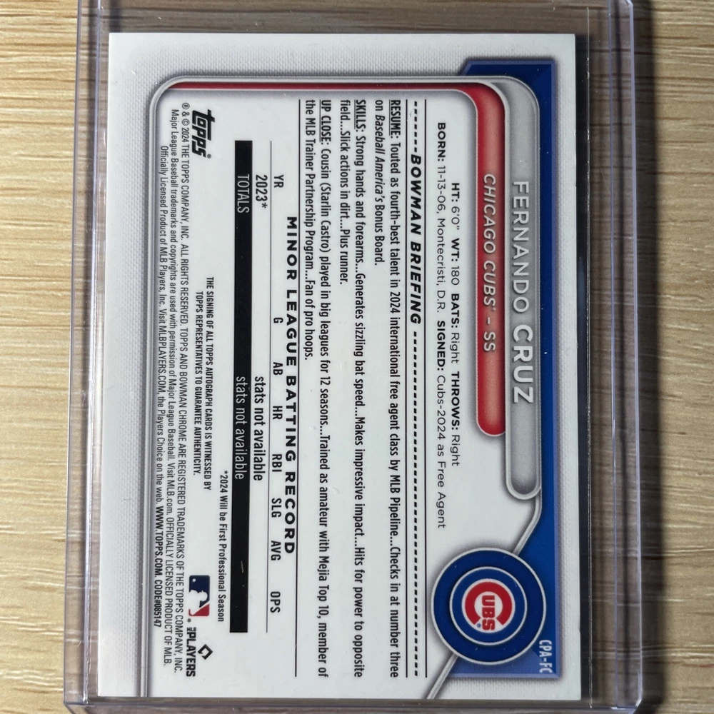 This 2024 Bowman Chrome Prospect HTA Choice Refractor trading card features Fernando Cruz, a player for the Chicago Cubs in the Major League Baseball (MLB). The card is autographed and comes with a serial number of /150. The card is near mint or better and is an original, manufactured by Topps. It is a single-insert and belongs to the 2024 Bowman Chrome - Prospect Autographs - HTA Choice Refractor set. This card is perfect for any baseball fan or collector looking for a unique addition to their collection.