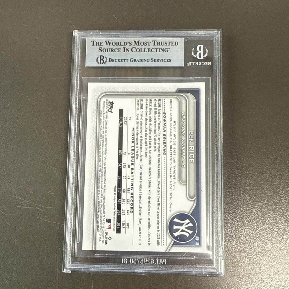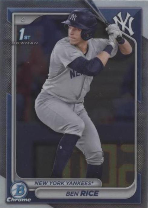 The product is a 2024 Bowman Chrome trading card featuring Ben Rice, a player for the New York Yankees in Major League Baseball. This card is a 1st Bowman card, indicating that it is Rice's debut card in the set. The card belongs to the Sports Trading Card category and is manufactured by Bowman. It is a valuable piece for collectors and fans of baseball memorabilia, especially those interested in the New York Yankees and up-and-coming players like Ben Rice.