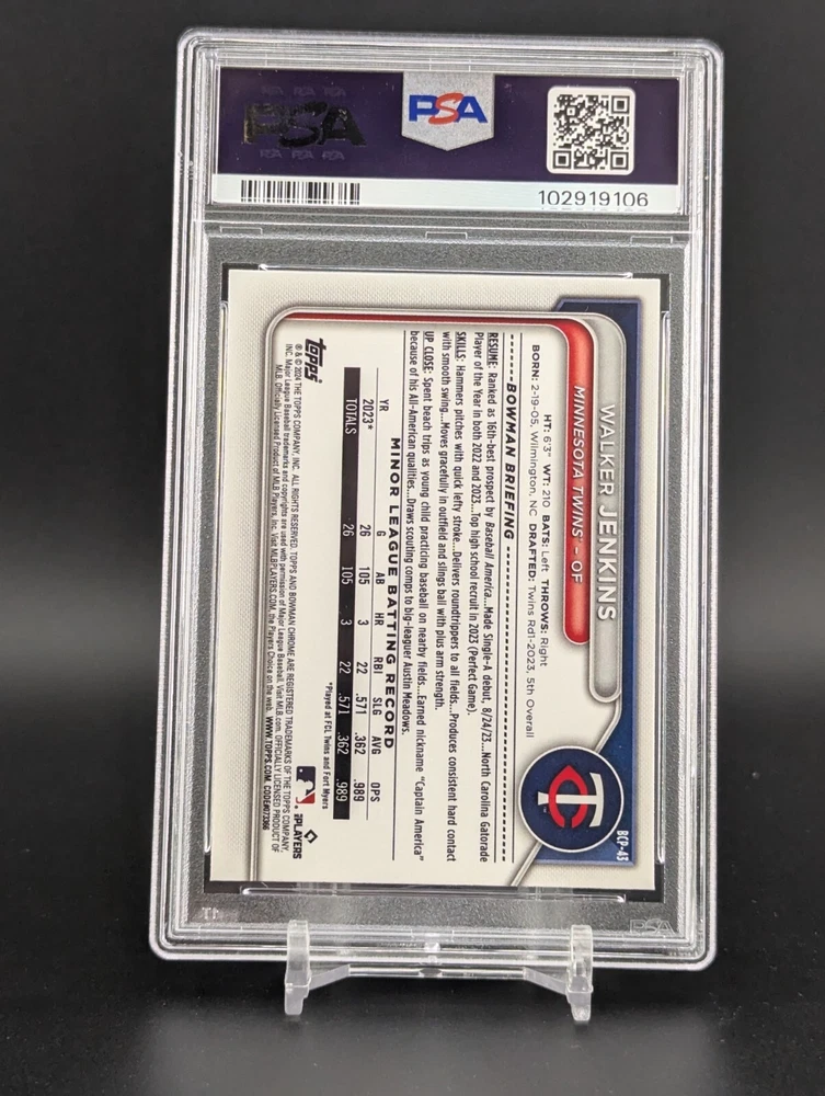 This is a rare and highly sought-after 2024 Bowman Chrome sports trading card featuring Walker Jenkins, a promising rookie from the Minnesota Twins team. The card is part of the Mega Box Mojo Refractor parallel/variety and boasts a range of exciting features, including being framed and having a hologram, short print, and 1st edition chase. It's a must-have for any baseball fan and collector, especially those who appreciate Topps's limited edition and exclusive collectibles. With its unique design and stunning visuals, this card is sure to be a standout addition to any collection. Don't miss your chance to own a piece of baseball history!