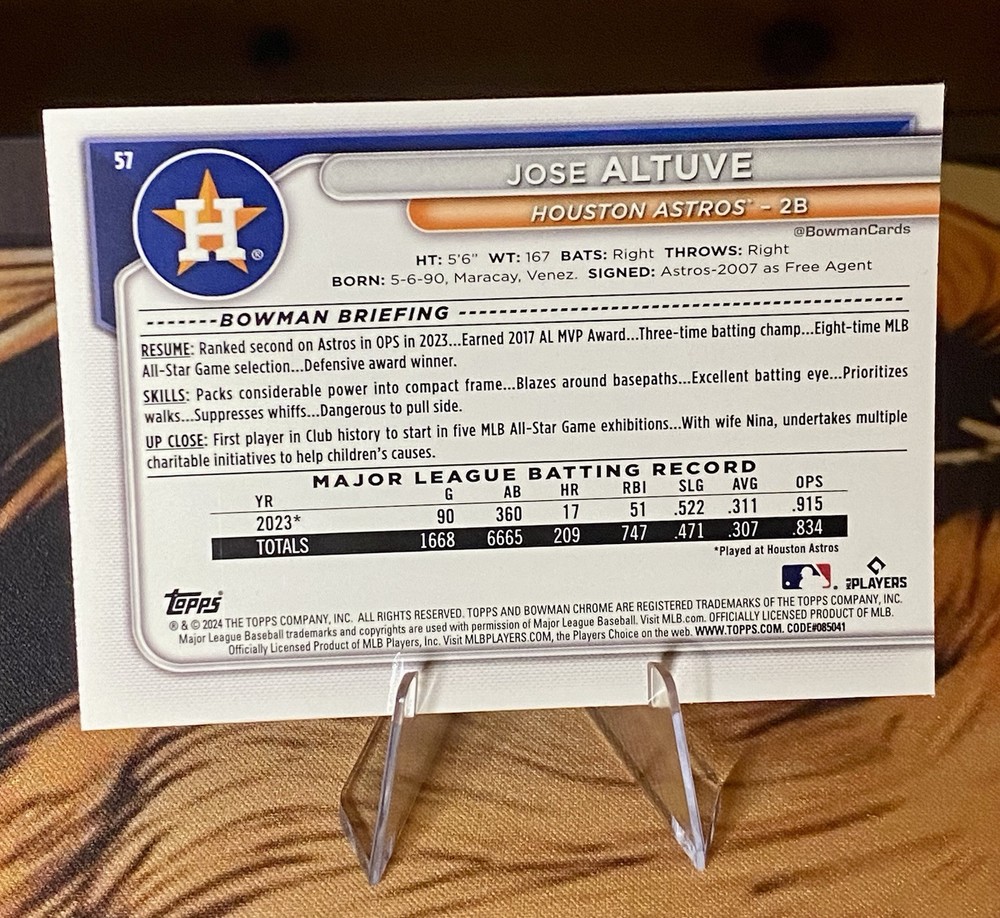 *This card came from card break slightly bowed out of the pack (unfortunately not uncommon for Bowman products). This item is a 2024 Bowman Chrome Sapphire trading card featuring Jose Altuve of the Houston Astros. This Gold Refractor card has a print run of 50 and is serial numbered 30/50. It is made of 35 Pt. card stock and is part of the Chrome Sapphire Edition. The card is in English and manufactured in the United States by Bowman. It is an original card, not a reprint, and does not feature an autograph. Thanks for checking out this listing! Please reference the pictures to assess the condition of this card, as I am a not professional grader and can not guarantee any sort of grade if you were to choose to submit this card. Shipping: - Non-Sports/Sports cards that are $20 and under will be shipped via PWE (55pt. & under). - Non-Sports/Sports cards that are over $20 or heavier cards (cards in holders or thicker cards) will ship in bubble mailer. The cost will be calculated for USPS Ground Advantage service. - All cards will ship within 1 business days after payment. - Tracking will be added to your order details once the item is packaged and ready for shipment (**eBay PWE uses a different tracking number than the USPS. You must look up easy ship on the internet for the tracking number website.) Bundling Orders: - Please send me a direct message if you would like to purchase multiple items and combine the shipping. Offers/Coupons: - All accepted offers are not eligible for other discounts or coupons.