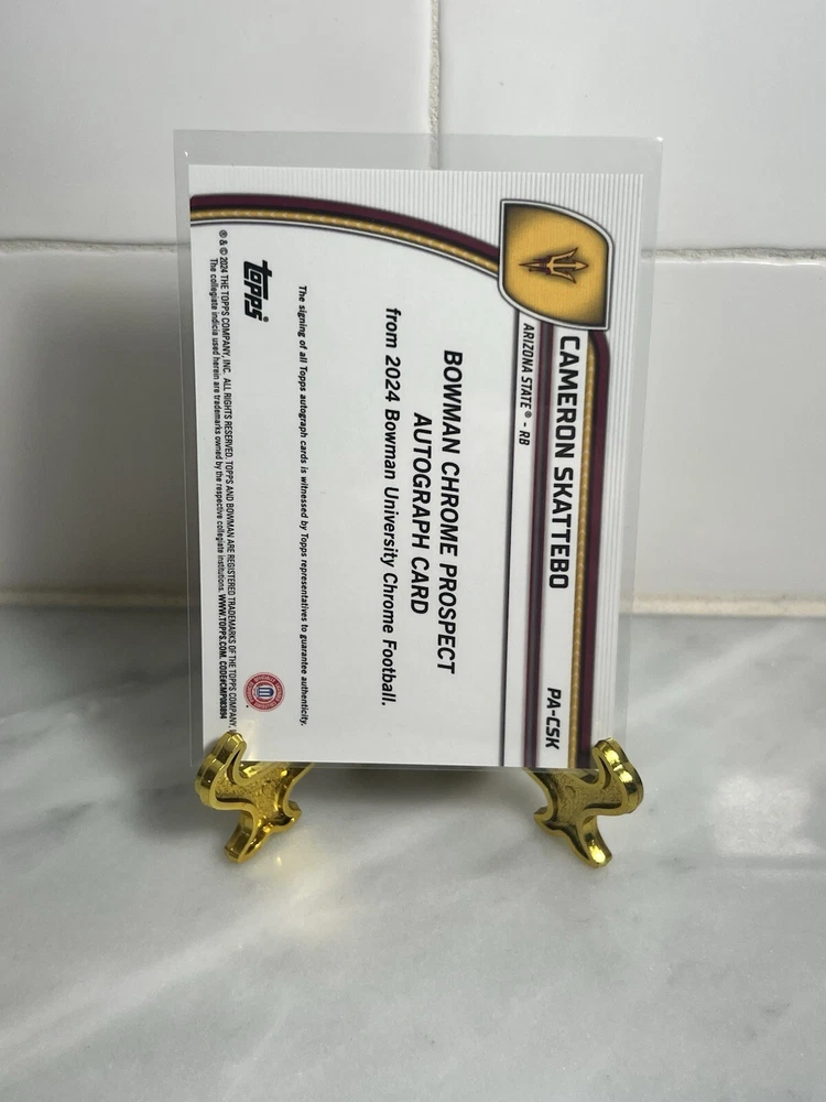 Capture the excitement of collegiate athletics with the 2024 Bowman Chrome University Cameron Skattebo 1st ROOKIE AUTO card. This collectible features the promising talent from the Arizona State Sun Devils, boasting an authentic autograph that makes it a standout piece for any football enthusiast or card collector. This card, numbered PA-CSK, is a gem from the 2024 Bowman set, showcasing the craftsmanship of Topps manufacturers. It's a chrome variety card that shines in any collection, presenting Skattebo in his rookie year, a must-have to remember the beginnings of what could be a storied NFL career.