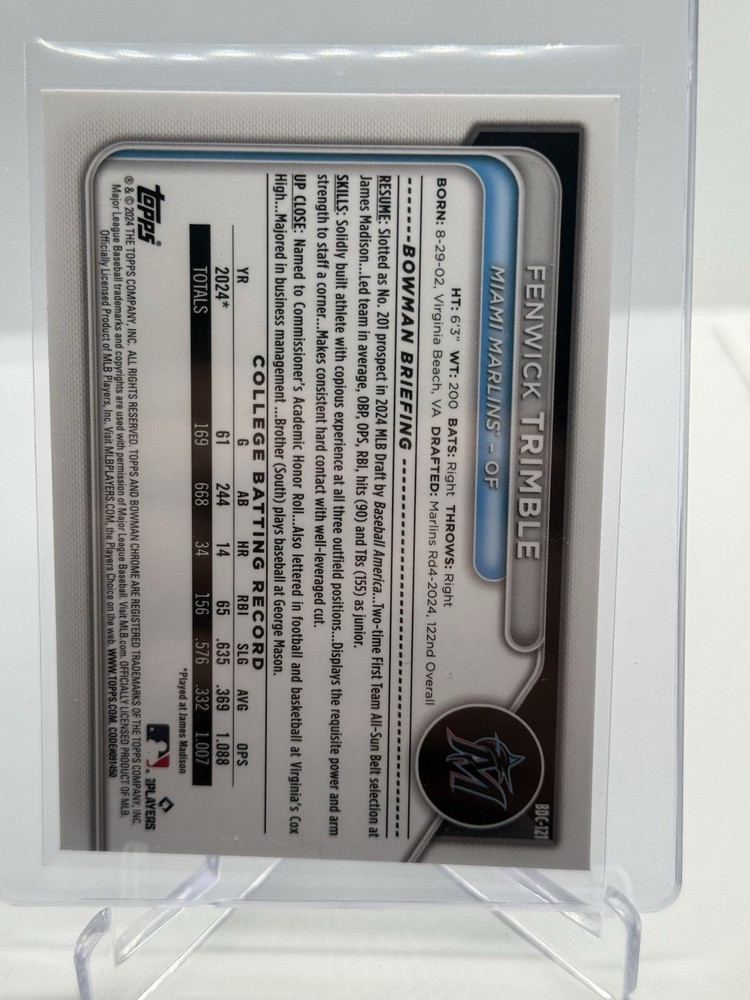 2024 Bowman Draft Chrome Aqua Lunar Refractor /125 Fenwick Trimble #BDC-121. Condition is Ungraded. Shipped with eBay Standard Envelope for Eligible Items up to $20.