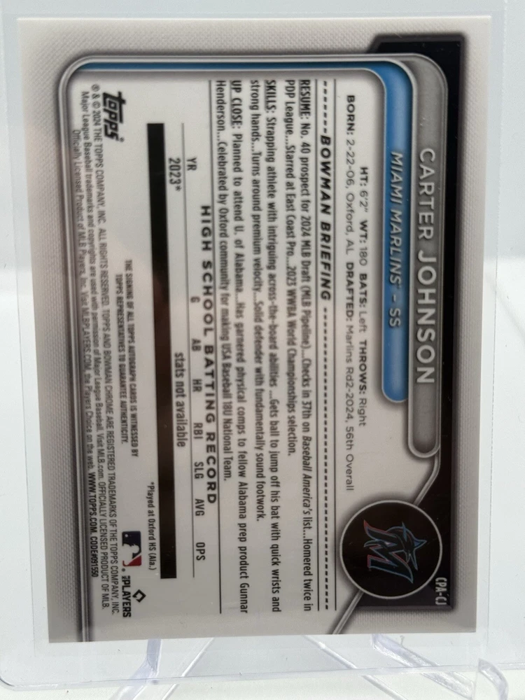 2024 Bowman Draft Chrome Carter Johnson 1st Bowman Auto #CPA-CJ Miami Marlins. Condition is Ungraded. Shipped with eBay Standard Envelope for Eligible Items up to $20.