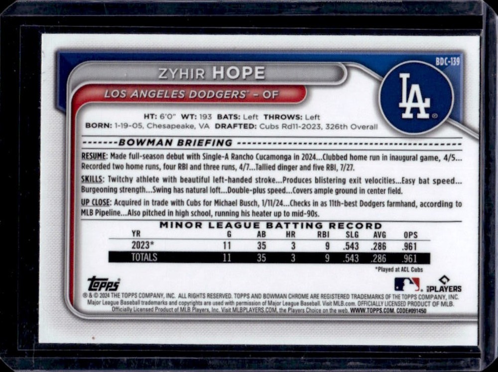 $ 0.532024 Bowman Draft Zyhir Hope Chrome Prospect Refractor #BDC-139 Dodgers