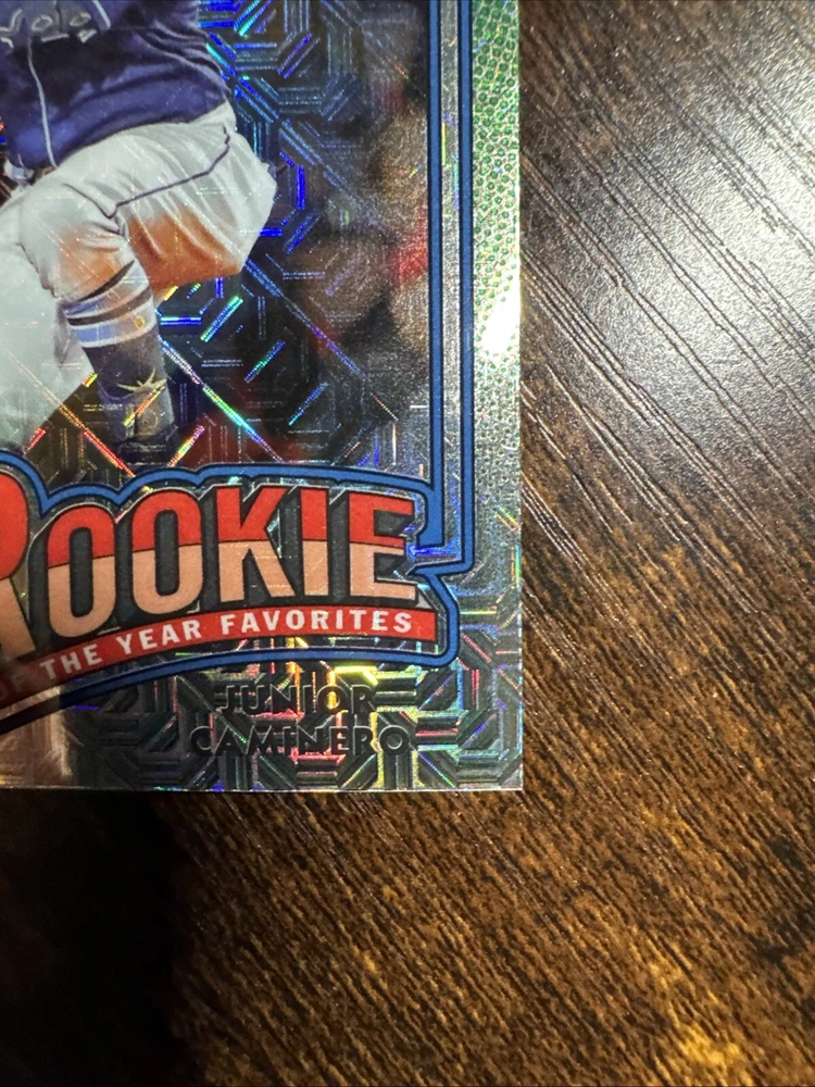 The product is a 2024 Bowman Mega Box Chrome Rookie of the Year Favorites trading card featuring Junior Caminero from the Tampa Bay Rays. This sports trading card is part of an insert set manufactured by Topps in the Major League Baseball (MLB) league. The card number is ROY-8 and it is a rookie card, highlighting Caminero as a promising new talent in the 2024 season. The chrome finish adds a premium touch to the card, making it a desirable collectible for fans and card enthusiasts.