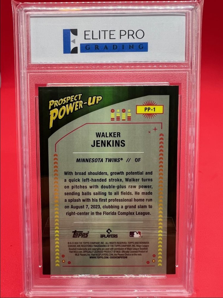 Card Number: PP-1 Sport: Baseball Manufacturer: Topps brand: Topps Series: Bowman League: Major League Baseball (MLB) Set: 2024 Bowman Team: Minnesota Twins Parallel/Variety: [Base] Features: Rookie, Insert Season: 2024 Player/Athlete: Walker Jenkins Insert Set: Prospect Power-Up