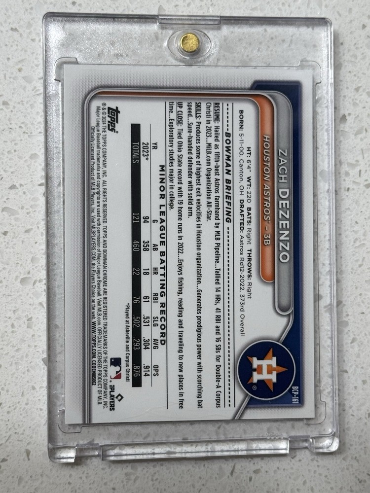 Elevate your baseball card collection with the 2024 Bowman Sapphire Zach Dezenzo Black /10 SSP, a must-have for enthusiasts and fans of the Houston Astros. This rare card, BCP-161, features the talented rookie in his Major League debut season, making it a prized asset for collectors. Its sleek black parallel variety ensures it stands out, while the serial numbered feature confirms its exclusivity. Crafted with quality in mind by the renowned manufacturer Bowman, this card captures the essence of the sport and the player. Measuring a standard 4" x 3", it's an original piece that has not been autographed, preserving the card's integrity. Perfect for those who appreciate the intricacies of baseball memorabilia, this card is a testament to Zach Dezenzo's promising career with the Astros.