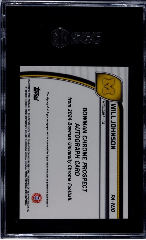 Capture a piece of football history with the 2024 Bowman Chrome University Will Johnson Orange Refractor Auto Rookie Card. This limited edition collectible, numbered to just 25, features the rising star from the Michigan Wolverines, making it a must-have for fans and collectors alike. Authenticated by Topps and autographed by Will Johnson himself, this card is secured with a label or sticker autograph format, ensuring its authenticity and adding significant value.The card, bearing the number PA-WJO, is part of the 2024 Bowman Chrome University set and showcases premium features such as serial numbering, a sleek orange parallel variety, and sought-after memorabilia. This sports trading card, crafted in the United States, is an original piece, not a reprint, and is presented in standard card size with English language details. Don't miss the chance to own a piece of the 2024 NCAA football season with this exceptional collectible.