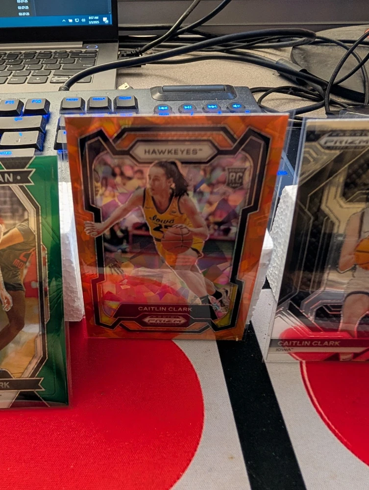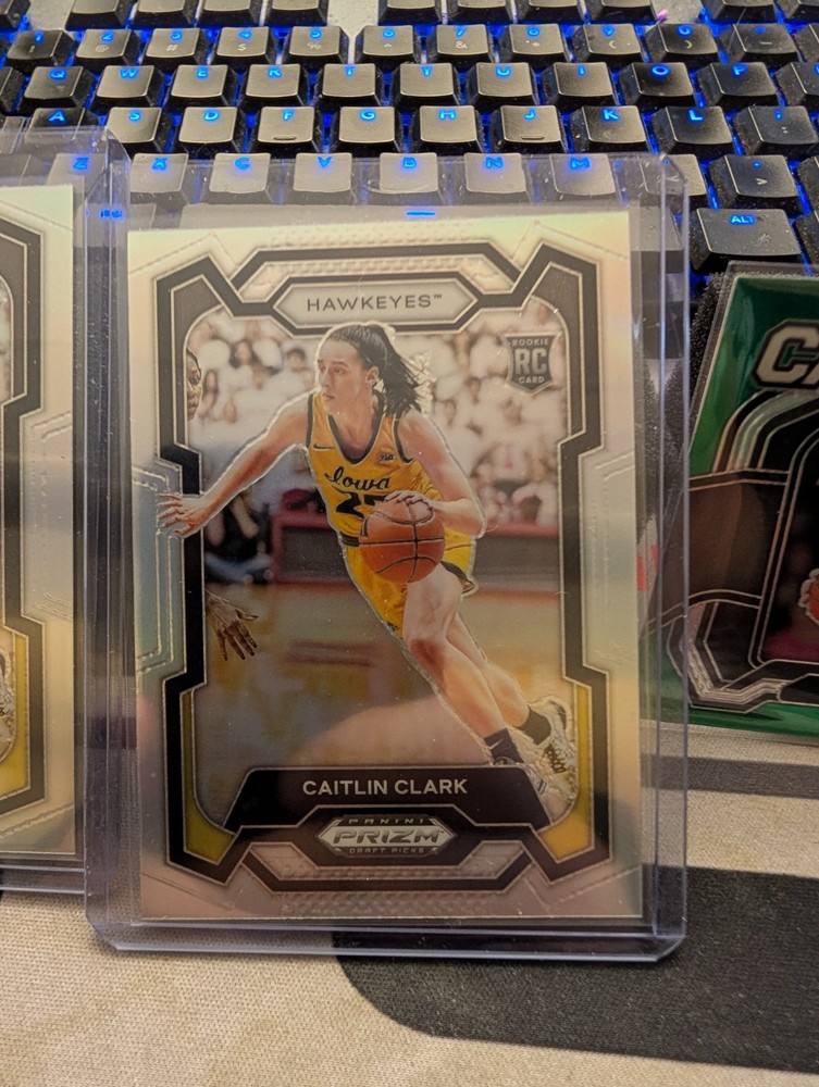Elevate your collection with this 2024 Caitlin Clark Rookie Card Lot, featuring a stunning mix of silver, green, and orange cracked ice parallels. This lot includes six premium cards, each showcasing the remarkable talent of basketball player Caitlin Clark, captured in high-quality detail by renowned manufacturer Panini. As a fan of the Women's National Basketball Association (WNBA), you won't want to miss the chance to own these special rookie cards from the 2024 season. With their insert features and sleek design, they are a must-have for collectors and enthusiasts seeking to commemorate Clark's exciting entry into the professional league.