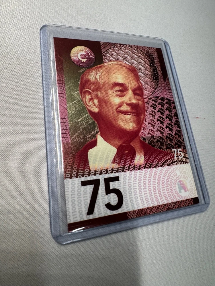 This is a rare Cardsmiths Currency "Cold foil" variant, featuring Ron Paul. This card is from the Series 3 set. This card was taken directly from the pack and placed in a penny sleeve and top loader upon opening, so it is in mint/near mint condition for the collectors out there! Shipping & Packaging: Card in penny sleeve and top loader will be packed carefully in a bubble mailer. It will be secured between 2 pieces of cardboard and placed inside the bubble mailer for extra protection during transit. *** NOTE *** Orders over $250 USD will be shipped in a USPS Priority Mail small flat rate box for extra protection during shipping. Can combine shipping if buying multiple cards. About Cardsmiths Currency Cards: The Cardsmiths Currency series takes collectors on a journey from the earliest days of civilization where mankind first bought, sold, and bartered for basic goods required for survival, to the present day, where technology, digital banking, and crypto power the world of commerce. Cards in this set range from persons of influence, memes, artifacts, and forms of money that have played an important role in development of civilization and the economy of today.