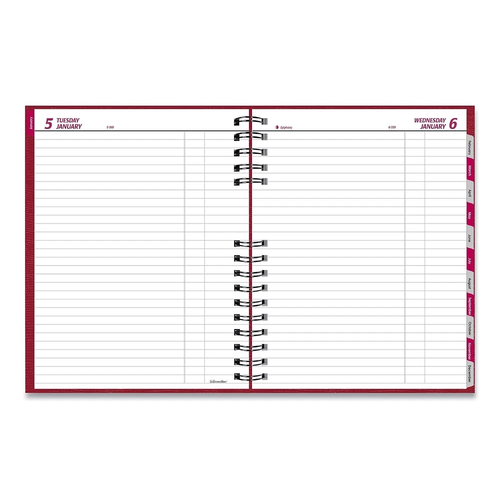 The CoilPro Daily Planner features 12 months of planning, spanning January 2024 to December 2024, with day-per-page in an untimed format. Large, feint ruled areas for entries contained on each page. Includes a cash record section. Contains current and perpetual calendars. Daily countdown of days passed and days to come, highlights holidays and phases of the moon. Telephone and address section. Self-adhesive tabs. Storage pocket. The durable hard cover is constructed with flexible twin-wire binding for a sturdy writing surface. English. Contains 50% post-consumer recycled materials. Forest Stewardship Council (FSC) Certified to help promote environmentally appropriate, socially beneficial, and economically viable management of the world's forests. Made in Canada. CoilPro patented planners combine the flexibility of a twin-wire book with the durability of a hard cover, available in a variety of sizes and formats. Dated Products are produced using acid-free paper to prevent color-change over time and vegetable oil-based inks to help protect the environment. CoilPro daily planner with day-per-page format, untimed, and large feint ruled areas for entries. English Twin-wire binding with lizard-like hard cover in Bright Red Current and perpetual calendars Countdown of days passed and days to come, highlights holidays and phases of the moon. Cash record section. Telephone and address section. Additional pages: 2024 and 2025 year planners, notes section, important dates list, metric, weight and temperature conversion, interest table. Self-adhesive tabs. Storage pocket Contains 50% post-consumer recycled materials. Forest Stewardship Council (FSC) Certified to help promote environmentally appropriate, socially beneficial, and economically viable management of the world's forests