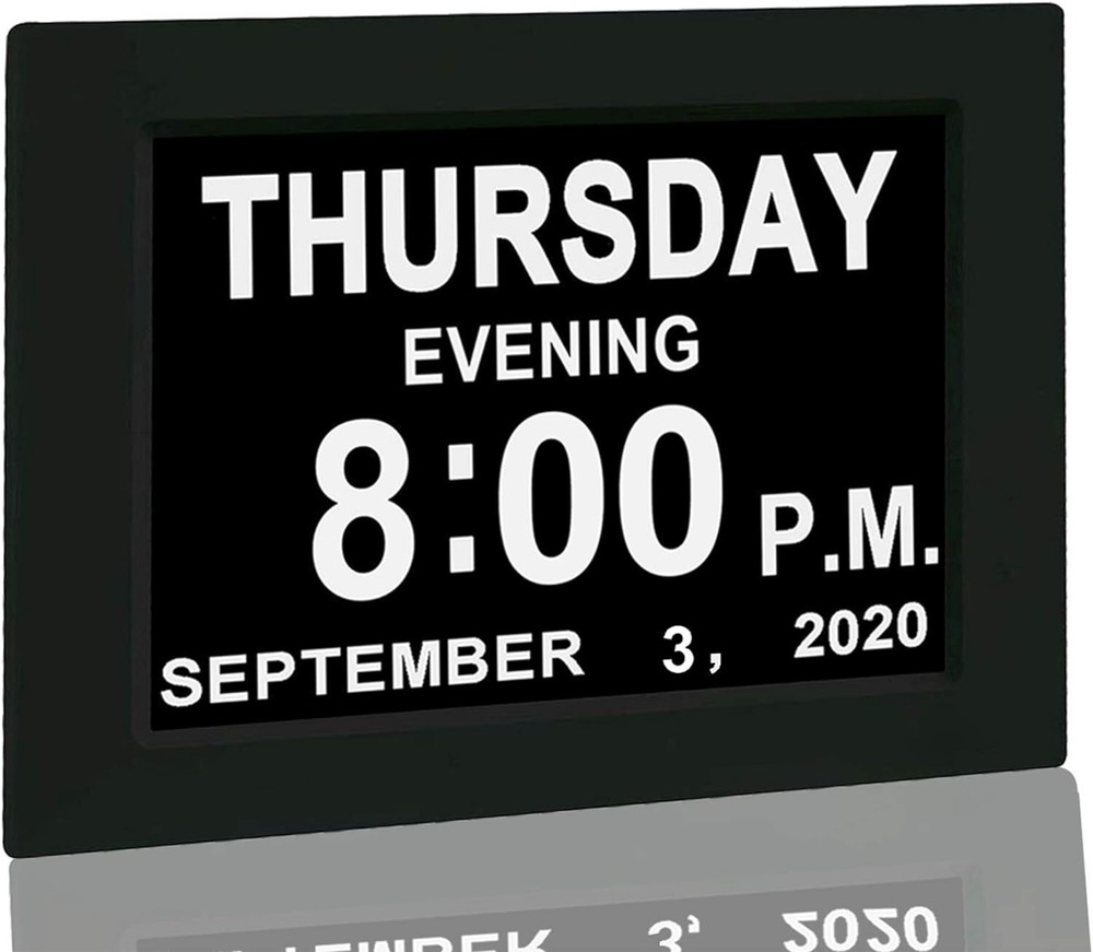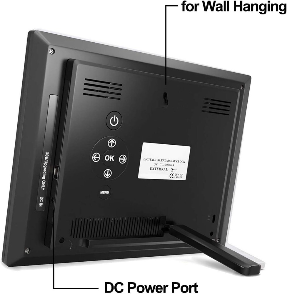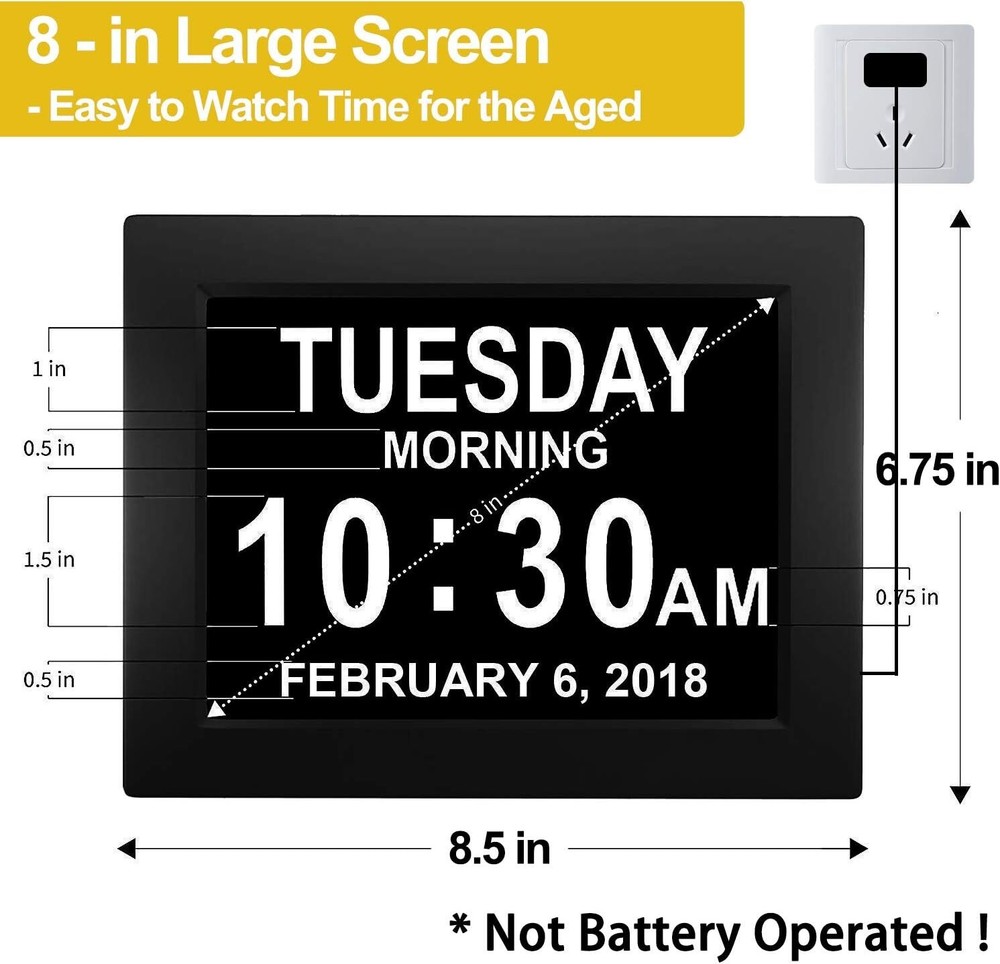 New 2024】 Digital Calendar Alarm Day Clock - with 8" Large Screen Display, am pm, Multiple Alarms, for Impaired Vision People, The Aged Seniors, The Dementia, for Desk, Wall Mounted, Black 【Large Screen Display】- 8" High Resolution Digital Alarm Clock clearly spells out the time, date, . It's clear enough to look at the time far away. -*** The clock is not battery operated.*** 【Multiple Alarm Settings】- There're 2-5 alarm settings available. It's the best clock to remind medicine taken throughout the day for the aged. 【Auto-Dimming Option】- The clock auto dims during the night at 7:00 pm (Mid Brightness or Low Brightness options) and brightens up during the day at 7:00 am (High Brightness). It also has the option to turn off the auto-dimming function, which is convenient for the people who prefer high brightness all the day. 【Ideal Gift】- It's a warm gift for elder parents. Make it much easy to look at the time from far away. A great clock for home living. 【Stylish Design for Décor】- This must be the most delicate alarm clock you've ever seen. It's not only a clock, but also a great decoration for your bedroom and bedside.