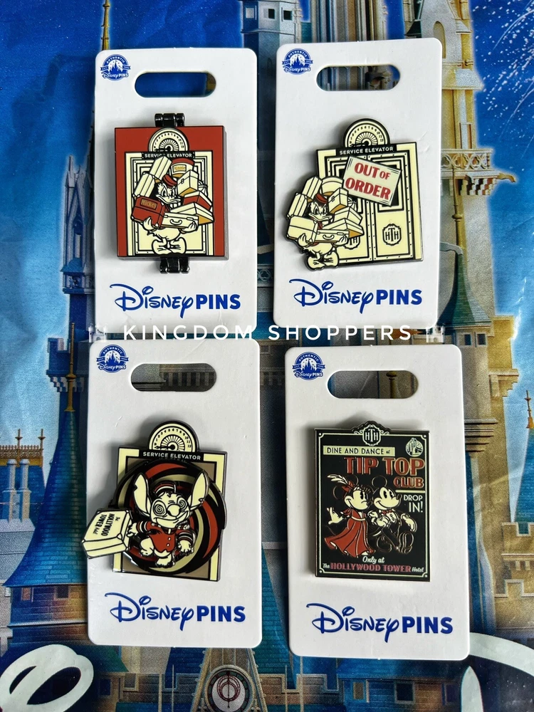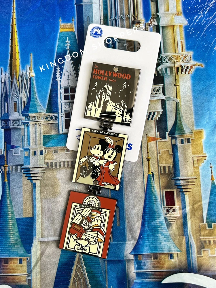 This collectible pin set features 4 different pins as shown from the popular Disney theme park attraction, Tower of Terror.