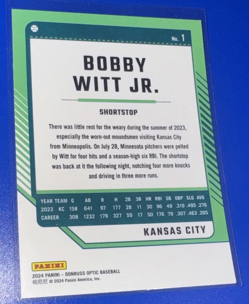 This 2024 Donruss Bobby Witt Jr. Optic baseball card is a must-have for any collector or fan of the Kansas City Royals. The card features a hologram, exclusive design, and is a limited edition item. It is part of the Optic Blue Velocity Prizm insert set and is a 1st edition card. The card is in standard size and manufactured by Donruss. It is a sports trading card and features Bobby Witt Jr., a rookie player for the Kansas City Royals. The card number is 1 and it is from the 2024 season. This card is perfect for those who are looking for a valuable addition to their collection or for those who want to show their support for the Kansas City Royals.