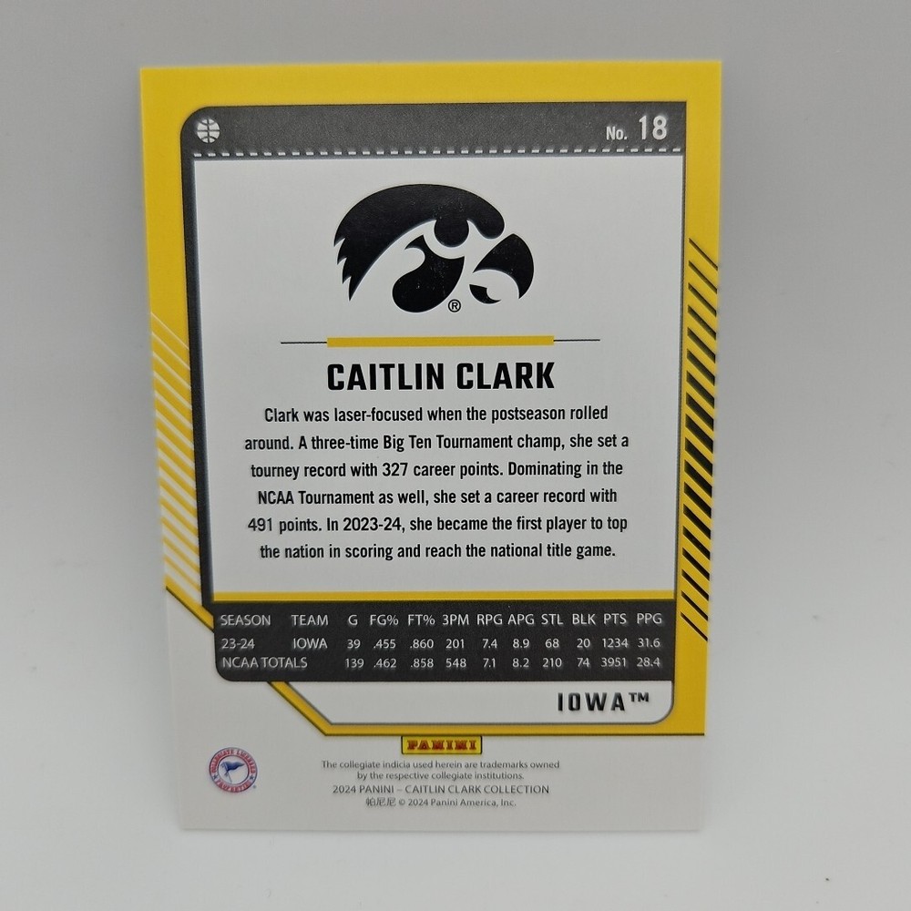 The product is a trading card featuring basketball player Caitlin Clark from the Iowa Hawkeyes, part of the 2024 Panini Caitlin Clark Collection by Donruss. This specific card is numbered 18 out of 199 and belongs to the Hearts parallel/variety. It is serial numbered as 021/199, adding to its collectible value. This sports trading card appeals to fans and collectors interested in adding a unique and limited edition card of Caitlin Clark to their collection.