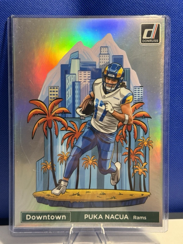 This is a rare and highly sought-after 2024 Donruss Puka Nacua Oversized Jumbo Prizm Oversize Downtown #20 trading card. It features a stunning design and showcases the talented Puka Nacua in his Los Angeles Rams uniform. The card is perfect for collectors and fans of the National Football League (NFL) and sports trading cards. With its oversized dimensions and Prizm parallel variety, this card is a true gem. It is manufactured by Panini and comes with Donruss autograph authentication. The card is a rookie card and features Puka Nacua's name, team, and card number. It is a must-have for any serious collector or fan of football.