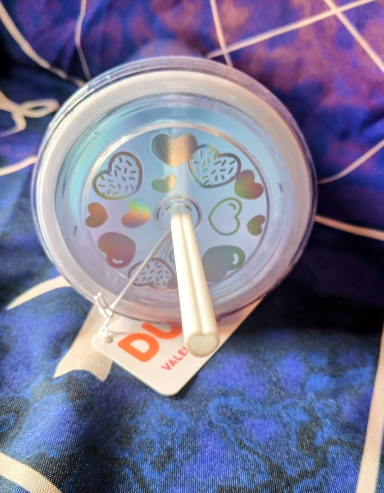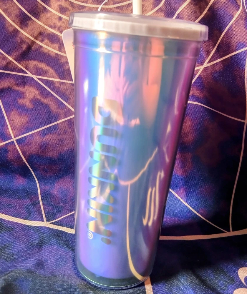 This beautiful iridescent tumbler from Dunkin' Donuts is the perfect gift for your loved one this Valentine's Day! The heart-shaped straw is a cute addition to the design. Whether you're a coffee or tea lover, this tumbler is perfect for carrying your favorite beverage with you on the go. With the iconic Dunkin' Donuts logo on the side, this tumbler is a must-have for any collector. The white color and coffee & tea theme make it a great addition to any kitchen or collection. Bid now on this limited edition Valentine's Day tumbler before it's too late!