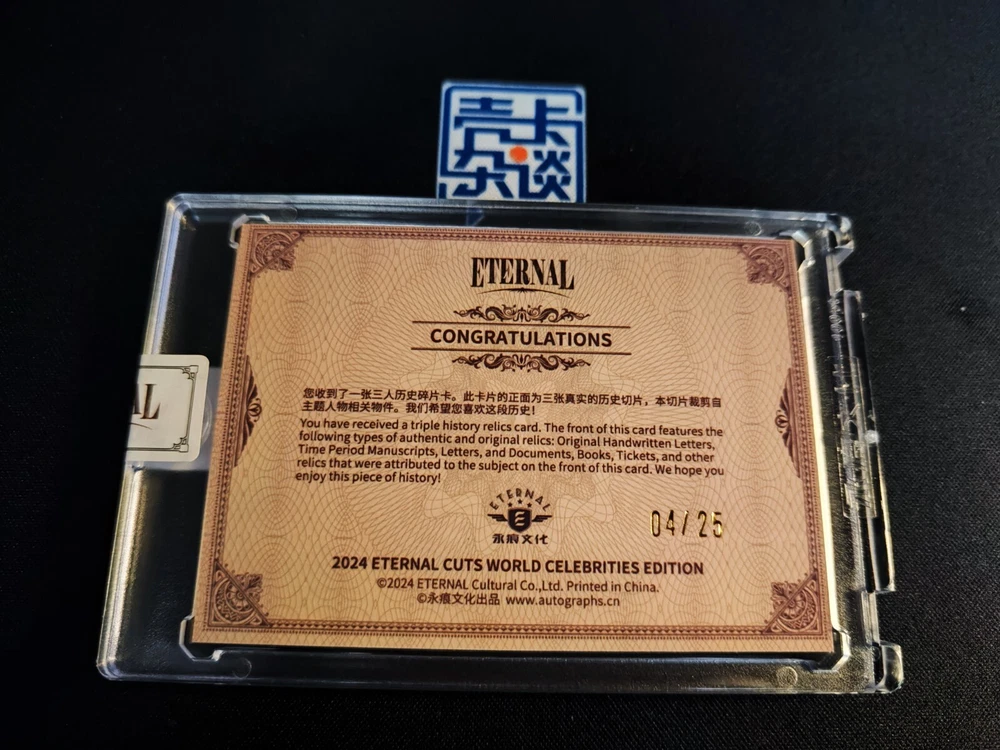 Card Name: Authentic History Relic Autograph Format: Cut Features: World Celebrities Franchise: World Celebrities Country/Region of Manufacture: China Autographed: No Manufacturer: Eternal Year Manufactured: 2024 Character: Johann Strauss II, Peter Tchaikovsky, Franz Schubert Type: Non-Sport Trading Card
