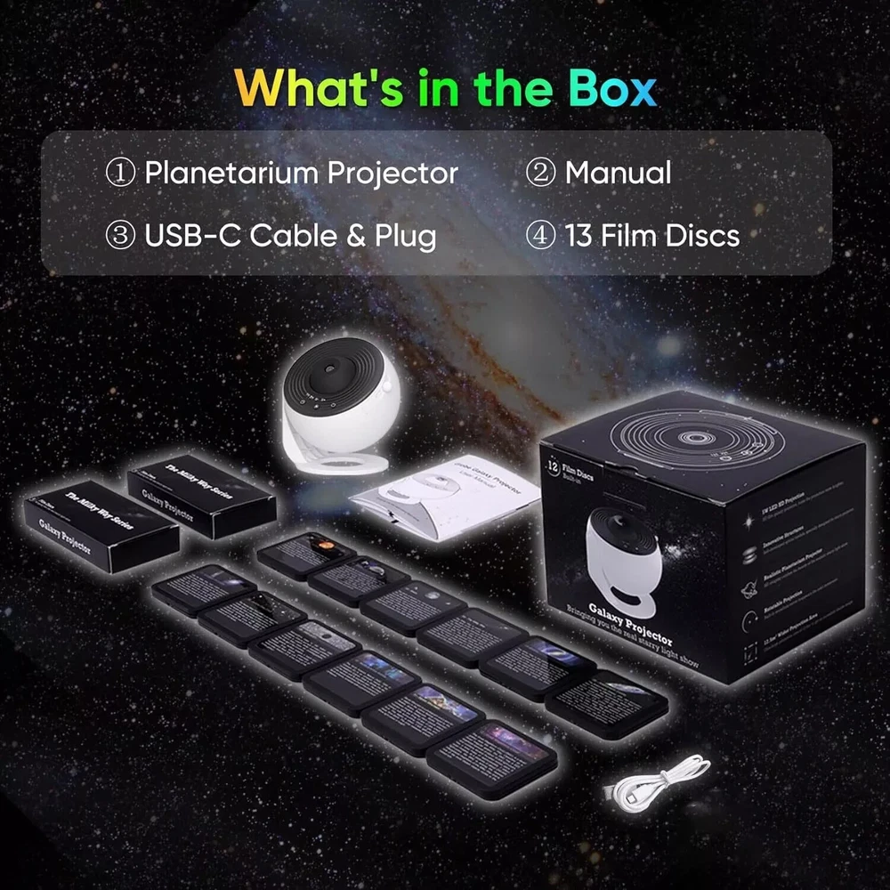 100% brand new and high-quality made. This galaxy projector equipped with 12 film discs featuring planets and natural lights. High definition galaxy lights will illuminate walls and ceilings with stars and nebulae, creating an immersive experience that transports you to the depths of a galaxy. Projectors 12 scenarios: Solar System, Earth,Moon, Milky Way,Galaxy,Andromeda Galaxy, NGC4302-NGC4298, Hubble Deep Field, M60--UCD1, North America Nebula, Mystical Mountain and Small Magells. The projector has a 360 degree rotation and a rotating knob for the film disc to create an immersive feel with a covering area of 135-754 m². Perfect for decorating your bedroom, game room, bathroom, home theater, ceiling ,wall, parties, weddings, birthdays and anniversaries. Great for bedroom by creating a soothing surrounding, equipped with auto shut off feature for 1 and 2 hours. Specifications: Color: White Material: Plastic Power Source: Corded Electric Style: Modern Projection area: 12.5 square meters Projection Diameter: 4M Recommended Projection Distance: 3M Product Dimensions: 5.7"L x 4.6"W x 4.9"H Package Includes: 1x Galaxy Star Projector 1x USB Cable 1x User Manual