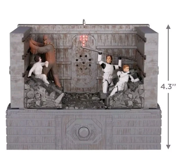 Relive the unforgettable scene from Star Wars: A New Hope as Luke Skywalker, Princess Leia Organa, Han Solo and Chewbacca find themselves trapped inside one of the Death Star’s garbage compactors. Featuring light, sound and motion, this Christmas tree ornament reenacts the tense moments as the walls press in, threatening to crush the heroes—unless Luke’s comlink and droid companions can come through in time. Requires Hallmark's Keepsake Power Cord (sold separately). Key Features: Connect the Magic Light, Sound and Motion ornament to Hallmark's Keepsake Power Cord (sold separately) to see a continuous light effect. Press the button to see the scene come to life with movement, light and dialogue from the film. Ornament plays memorable lines from Star Wars: A New Hope. Includes: One 2024 Keepsake Ornament in gift box for easy gift giving, preservation and storage. Requires Hallmark's Keepsake Power Cord (sold separately). No batteries necessary. Approx. Size in Inches: 5.7 x 4.3 x 4.1