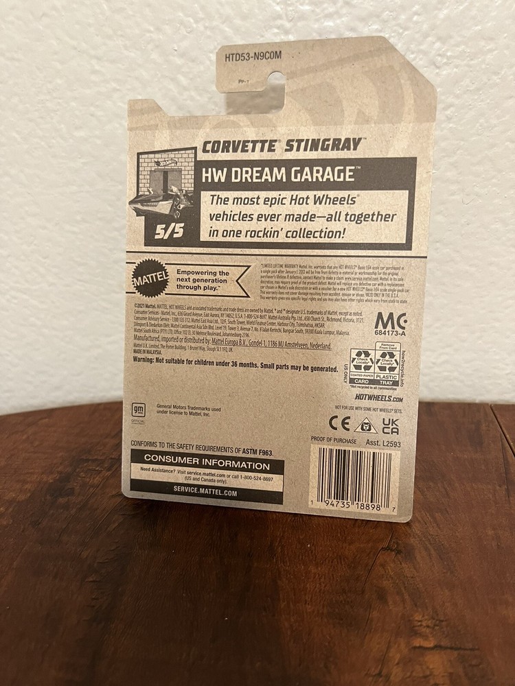 This 1:64 scale Hot Wheels Corvette Stingray is a must-have for any car enthusiast. The blue metal model features intricate details and is part of the HW Dream Garage series. It is recommended for ages 3 and up and is perfect for both boys and girls. The car is not customized and has not been modified in any way. It is an authentic Hot Wheels product made in Malaysia.