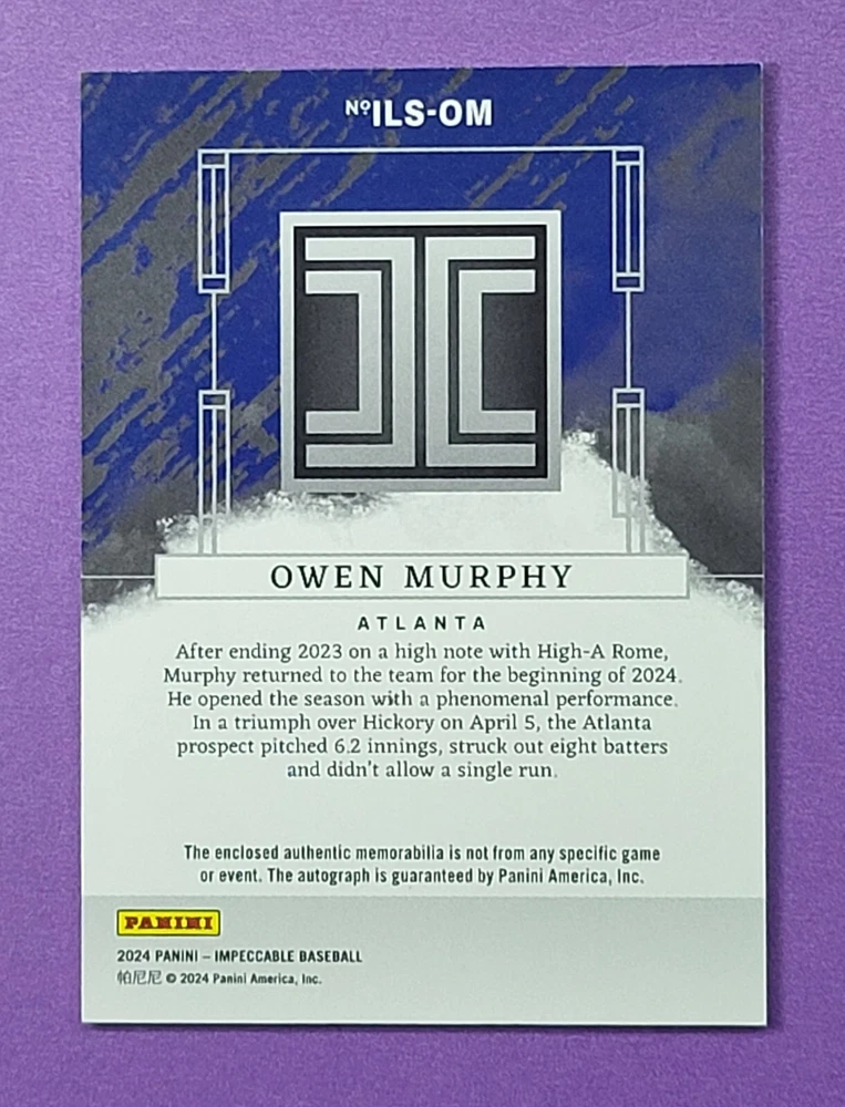 2024 Panini Impeccable *Owen Murphy* 'Impeccable Lumber Signatures' On-Card Prospect Autograph Bat Relic ( Numbered #62/99) Condition: Our items are fresh out of packs with the least amount of handling possible and treated with the utmost care. However, this item is not professionally graded. I encourage you to review the pictures posted to make a final determination. We only sell high grade cards fresh from packs. If we were to sell a card with significant flaws, they would be noted boldly. Feel free to ask questions, we want you to be comfortable and confident in your purchase! Shipping: Packaged very carefully and professionally within 1-2 days of payment...care goes into this step. Combined shipping always available for multiple purchases! Contact: Please contact us with questions or concerns. We want make sure you're happy with your purchase! Thank you! Card Sick