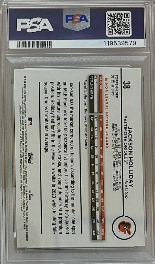 The 2024 Jackson Holliday Topps Gilded Collection Gold Wave Refrac trading card is a highly sought-after collectible for fans of Major League Baseball and the Baltimore Orioles. Featuring a limited print run of only 09/75 cards, this card showcases the rookie player Jackson Holliday in a luxurious gold wave parallel design. Part of the exclusive Gilded Collection set by Topps, this card is serial numbered, making it a rare and valuable addition to any sports card collection. With its unique design and limited availability, this card is sure to be a prized possession for collectors of baseball memorabilia.