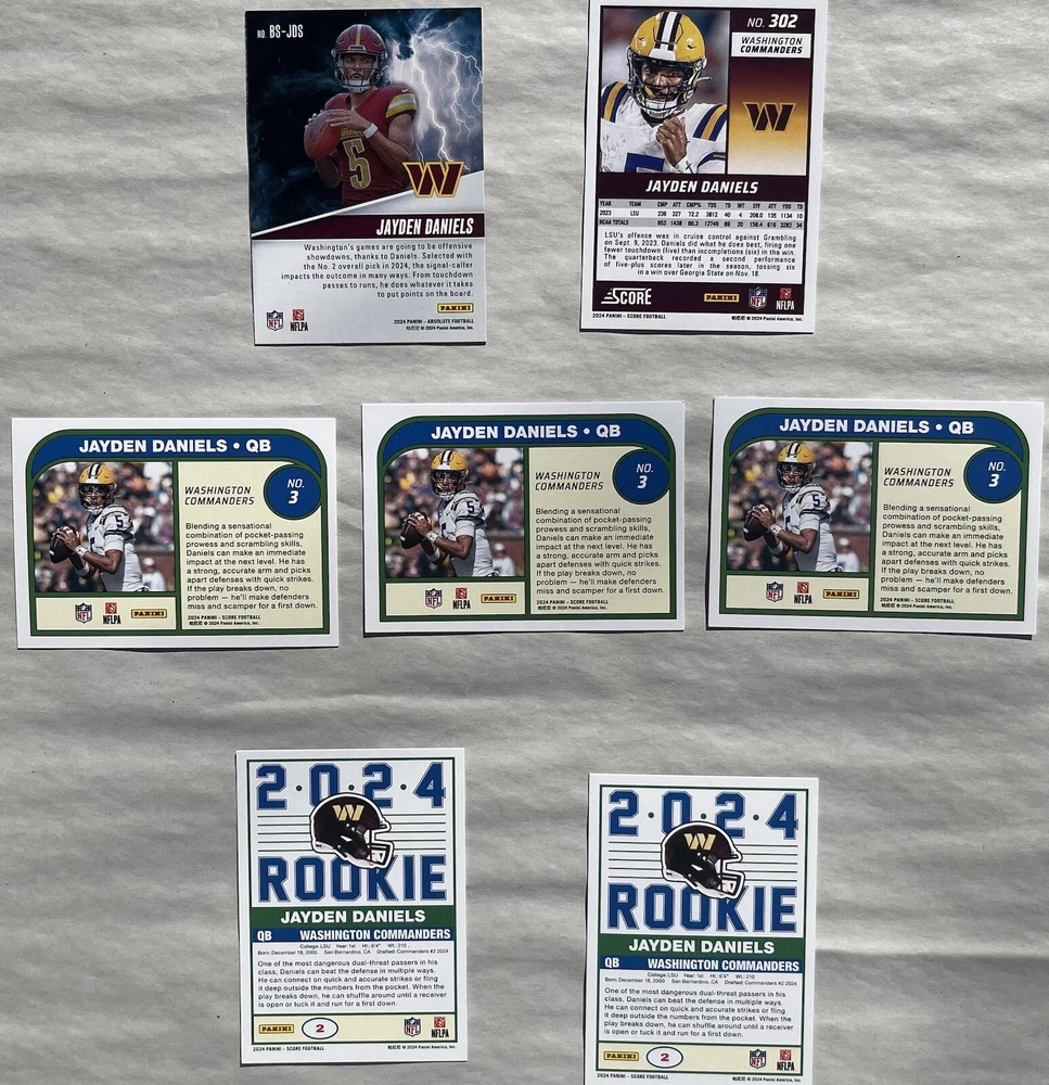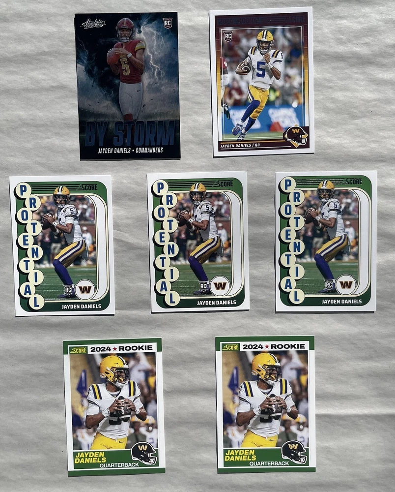 All cards come in penny sleeve and top loader Card list: 3 x 2024 Score Protential Jayden Daniel’s RC 2 x 2024 Score Throwback Jayden Daniel’s RC 1 x 2024 Score Jayden Daniel’s RC 1 x 2024 Absolute Jayden Daniel’s By storm insert RC