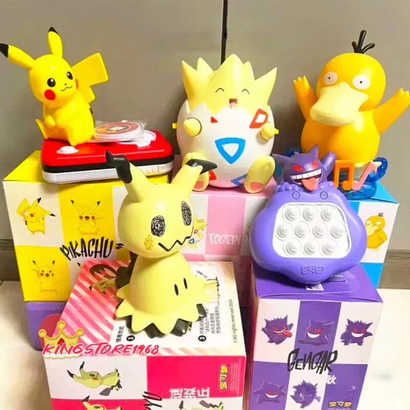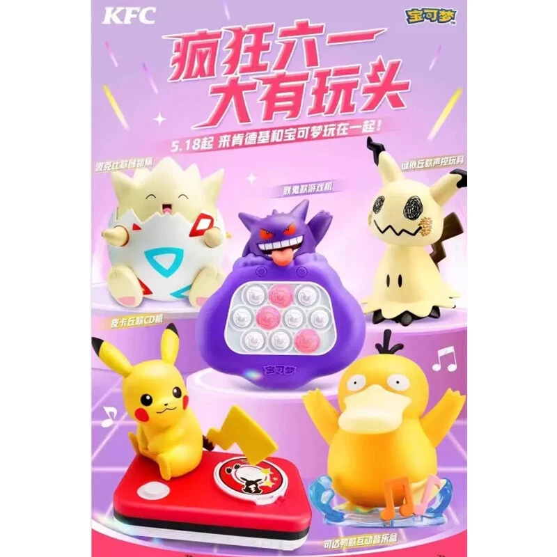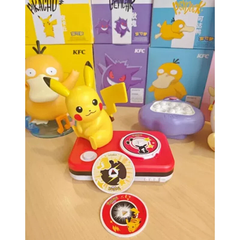 2024 KFC Children's Day Pokemon Characters Toy New In Box Pikachu Psyduck New In Box 1,pikachu---CD player have battery,3 pcs CD can change music,press the tail,can sing. box size:20*16.5*11cm 2,psyduck---music box have battery, touch two hands,will sing,touch the hair can change music. box size:13.5*14.5*16cm 3,gengar---game machine have battery,where light,touch it. box size:13.5*16*7cm 4,mimikyu---voice control toy have bettery,can move and sound box size:15*14.5*19.5cm 5,togepi---storage box have sticker,hand can swing box size:14.5*13.5*15.5cm