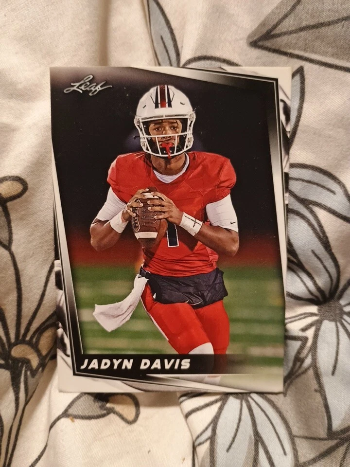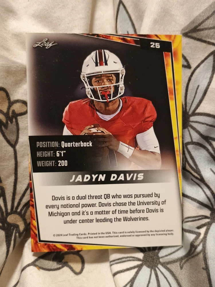 This 2024 Leaf Football Jadyn Davis #25 Rookie Card RC is a must-have for any University of Michigan fan. The card features the highly touted linebacker in his Michigan Wolverines uniform, making it a great addition to any sports trading card collection. The card is made of standard card stock and is part of the base set, adding to its value. The card is an original and comes straight from the manufacturer, Leaf. It is not autographed and is not a licensed reprint. The card is in English and has a card thickness of 20 Pt. The card is perfect for fans of the National Collegiate Athletic Association (NCAA) and the sport of football.