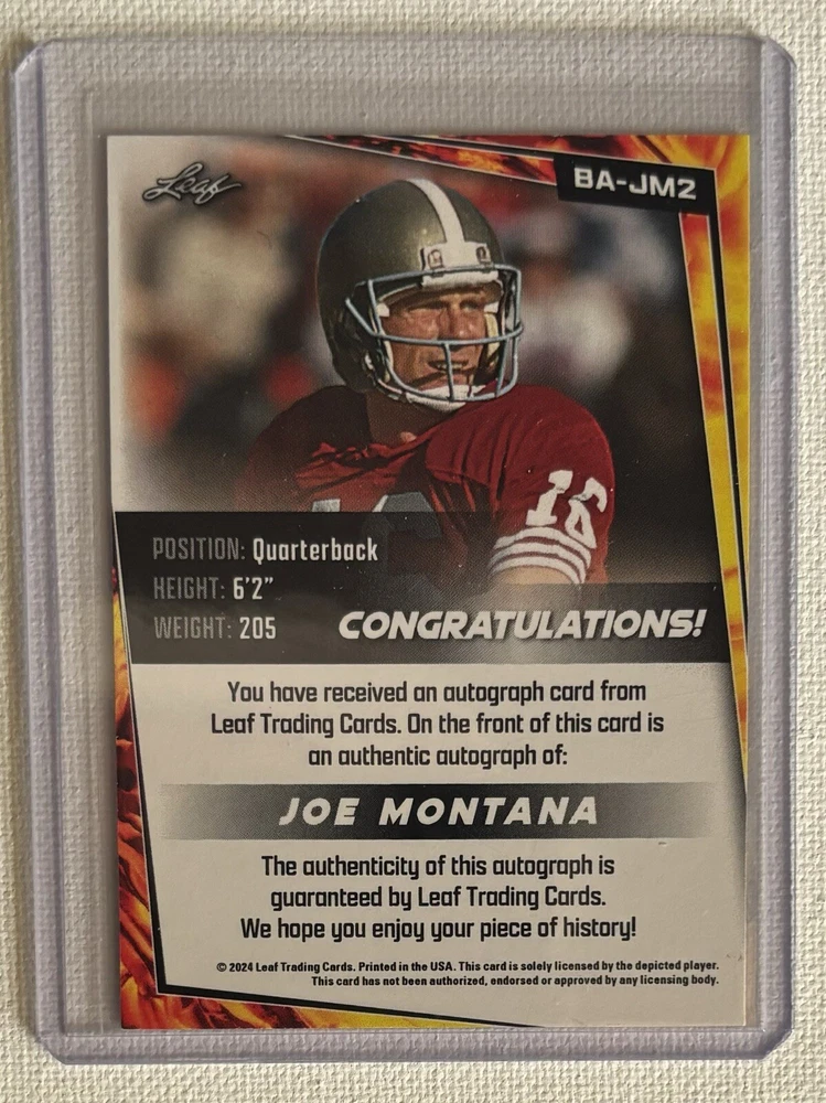 This is a rare 2024 Leaf Joe Montana autographed trading card, featuring the legendary quarterback in his San Francisco 49ers uniform. The card is a gold parallel variety, with only three in existence, making it a highly sought-after item for any football fan or collector. The autograph is authenticated by Leaf, and the card is part of the 2024 Leaf set. It features Montana's signature on a label or sticker, adding to its value and appeal. This card is a must-have for any serious collector or fan, and is sure to be a standout piece in any collection.