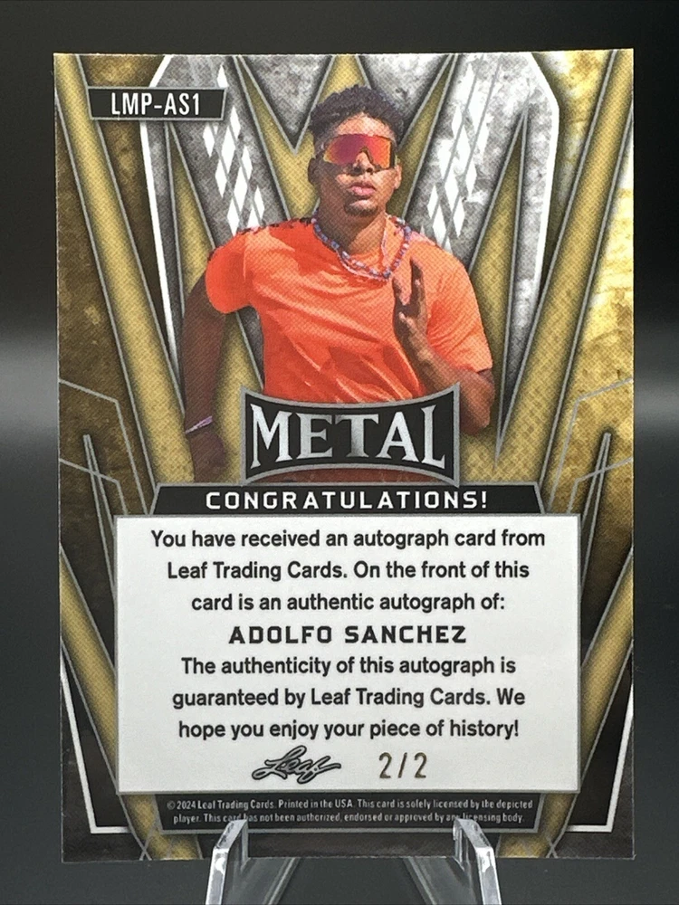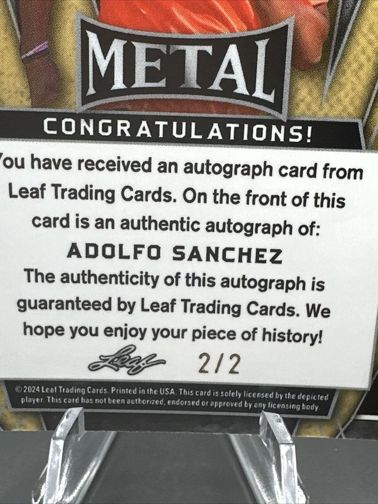 This 2024 Leaf Metal Preview trading card features Adolfo Sanchez, signed by the Cincinnati Reds player himself. The card is a Blue Mojo Refractor parallel/variety, with a print run of 2/2, making it a rare and highly sought-after addition to any collection. Made from sturdy card stock, this original Leaf card is authenticated and comes with a label/sticker autograph format. It is a red parallel/variety rookie insert, with memorabilia and serial numbering features. The card is from the 2024 season, manufactured in the United States, and is part of the Major League Baseball (MLB) league. It is a great investment for any baseball fan or card collector.