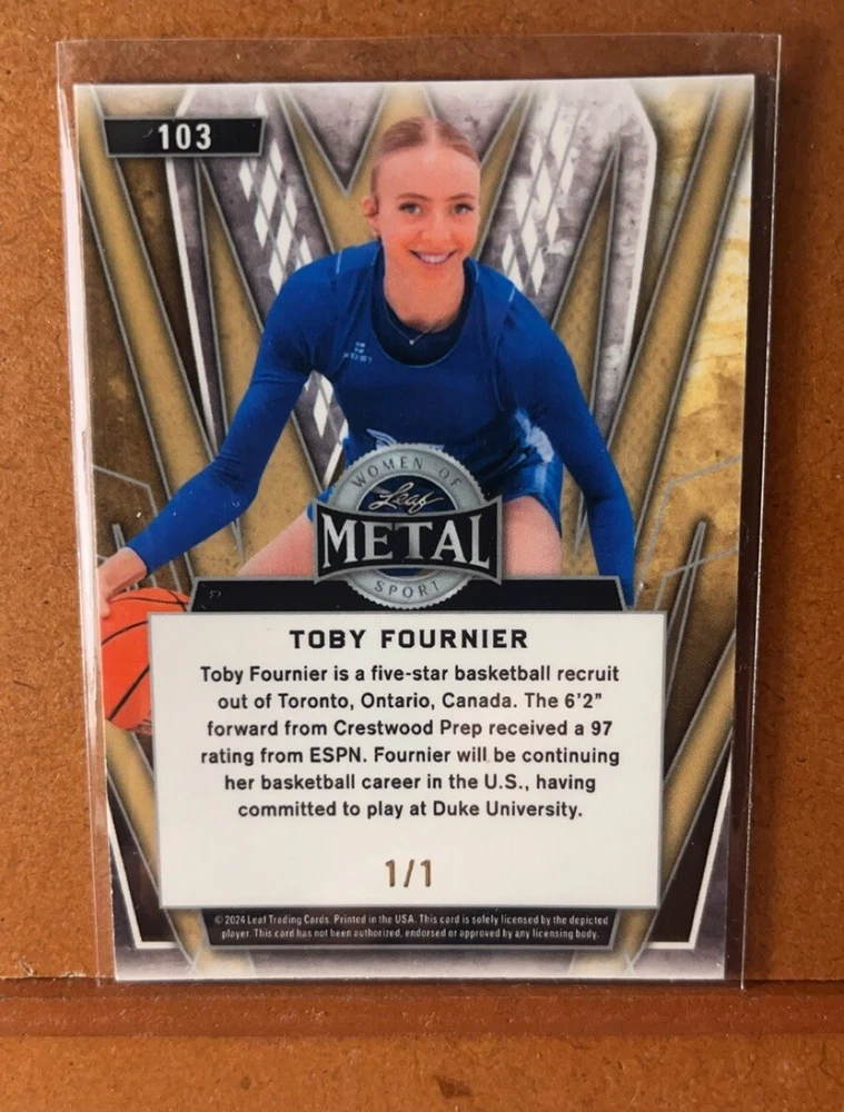 This 2024 Leaf Metal trading card features Toby Fournier of the Duke Blue Devils, with a serial number of 1/1. The card is in excellent shape, with a blue pulsar parallel variety that adds a unique touch to this already rare card. It is a 2024 season rookie card, and is part of the National Collegiate Athletic Association (NCAA) league. The card is ungraded, but near mint or better in quality. The autographed feature is not present on this card. It is a sports trading card, and is perfect for collectors or fans of basketball. The set is manufactured by Leaf, and is a must-have for anyone who values sports memorabilia.