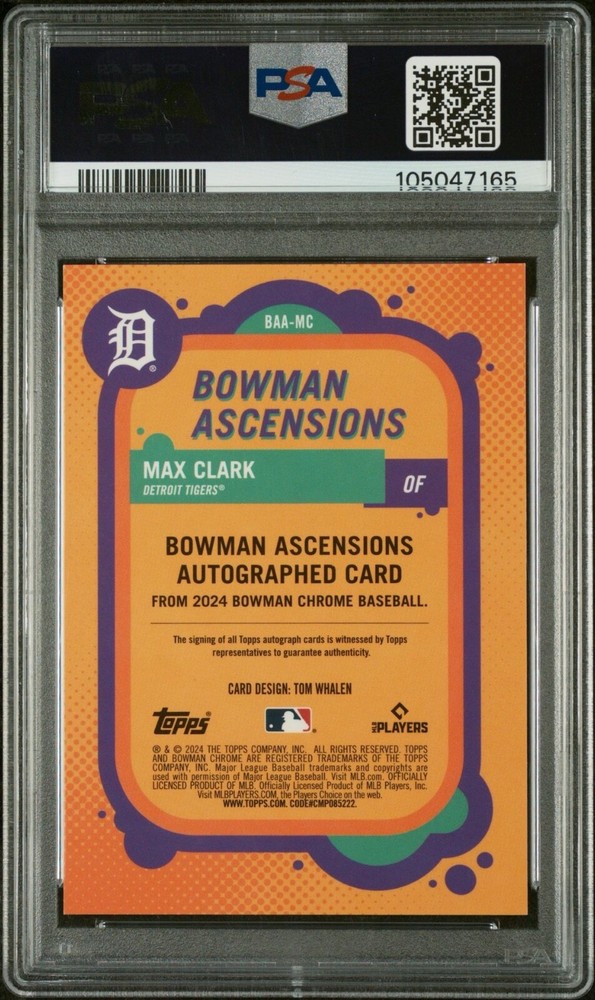 This is a 2024 Bowman Chrome Bowman Ascensions Autograph trading card featuring Max Clark of the Tigers. The card is autographed by Max Clark and authenticated by Topps. It has a print run of 150 and is graded as a PSA 9. The card is a Chrome parallel variety and is serial numbered. It is a rookie card and part of the Major League Baseball (MLB) league.