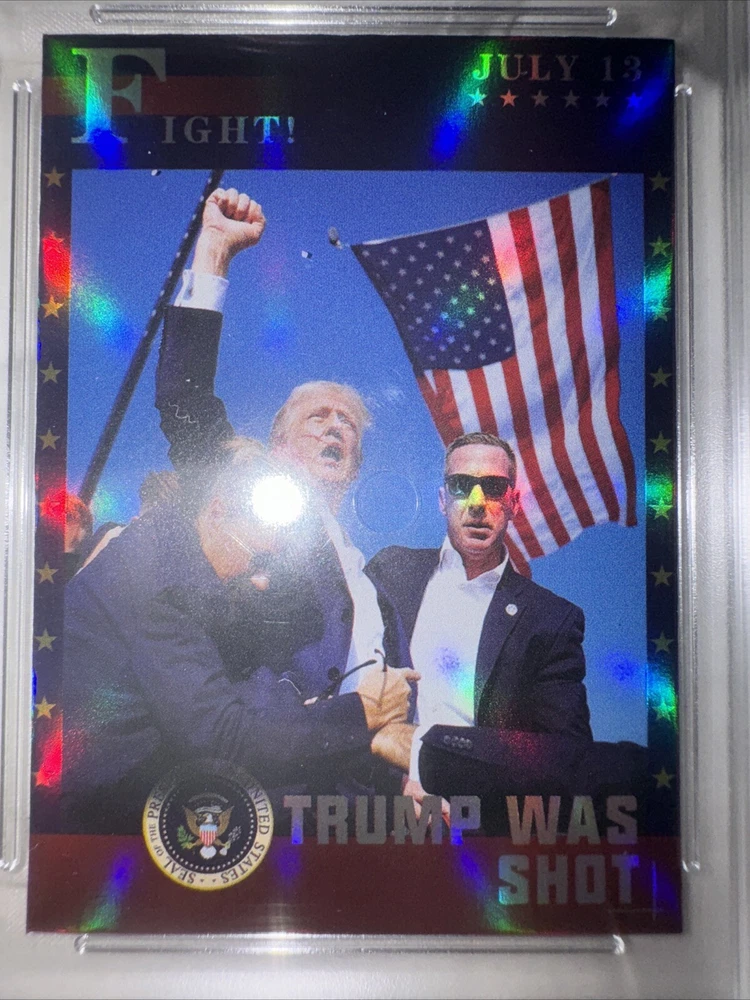 Language: English Autograph Format: N/A Convention/Event: July 13 3024 Fight to save america Character: Donald Trump Autographed: No Year Manufactured: 2024 Card Name: 2024 Merrick Mint Donald Trump Assassination Attempt Featured Person/Artist: Donald Trump Type: Non-Sport Trading Card Set: Election Features: Chase, Collectors Edition, Exclusive Material: Card Stock Parallel/Variety: Exclusive Card Number: July 13 2024 Franchise: Heroes, Politics, US Presidents Manufacturer: Unbranded Country/Region of Manufacture: United States Signed By: N/A Genre: History, Military, Political Card Size: Standard