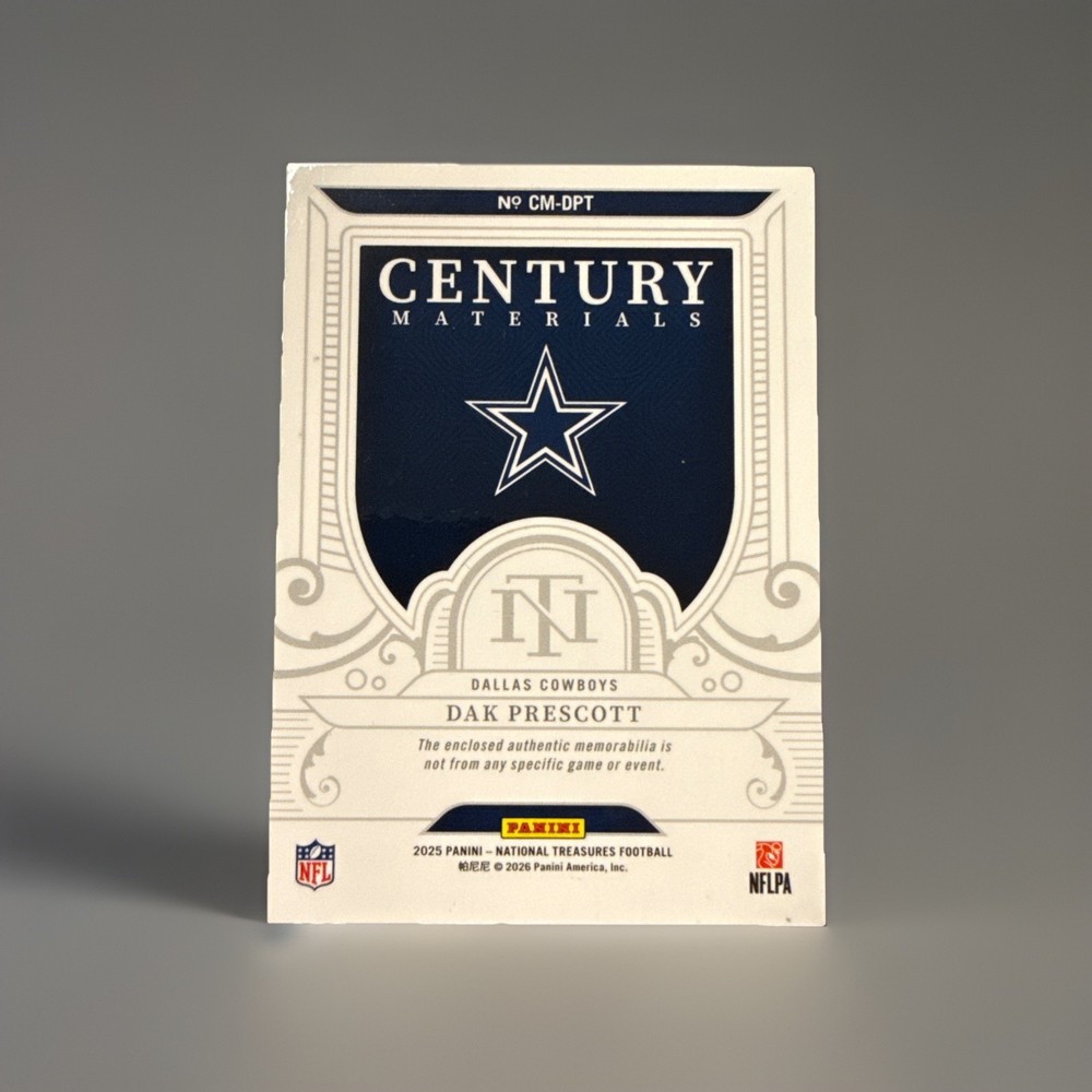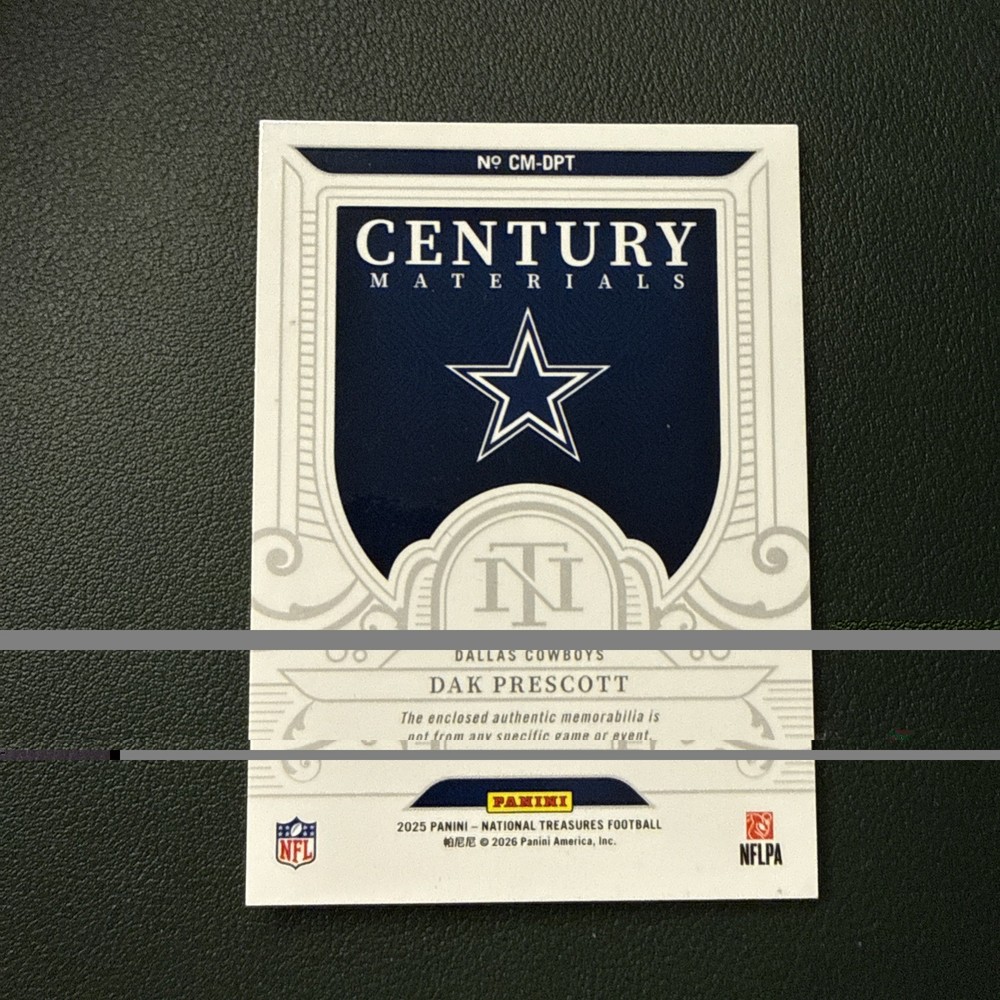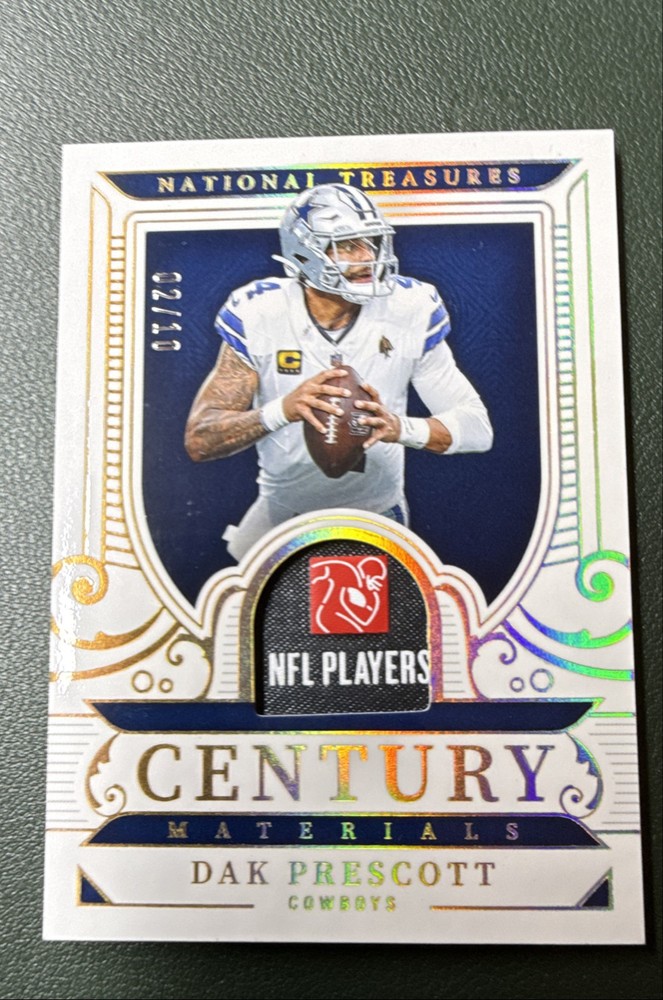 The 2024 National Treasures Century Materials Dak Prescott Holo Gold /10 NFL LOGO trading card is a highly collectible item featuring the Dallas Cowboys quarterback. This limited edition card, part of the 2024 Panini National Treasures set, showcases a unique holo gold design with the NFL logo, making it a prized possession for any football card collector. With only 10 copies in existence, this serial numbered card is a rare find and a must-have for fans of Dak Prescott and the Dallas Cowboys.
