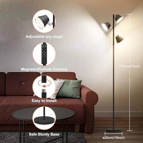 Brightness: 3900 Lumen UPC: Does Not Apply Batteries Required: No Material: Metal Lamp Type: Floor Lamp Date First Available: August 12, 2024 Room Type: Office, Bedroom, Living Room MPN: Does Not Apply Color: Black Switch Type: Remote Power Source: Corded Electric Item Weight: 9.48 pounds Included Components: Remote Control, Adapter Control Method: Remote Light Source Type: LED Is Cordless: No Item Width: 1 Color Temperature: 6500 Kelvin Connectivity Technology: RF Indoor Outdoor Usage: Indoor Recommended Uses For Product: Reading Type: Does Not Apply Country of Origin: China Special Features: Adjustable Color Temperature Voltage: 120 Volts Item Height: 1 Product Dimensions: 10"D x 10"W x 68"H EAN: Does Not Apply Part Number: 42W-TFL-RF Specific Uses For Product: Reading Brand: Does Not Apply Batteries Included: No Customer Reviews: 5.0 out of 5 stars Lighting Method: Adjustable Is Electric: Yes Special Feature: Adjustable Color Temperature gtin13: Does Not Apply Shade Color: black Number of Items: 1 Style: Modern Item Length: 1 Wattage: 42 watts Manufacturer: Does Not Apply Item model number: 42W-TFL-RF
