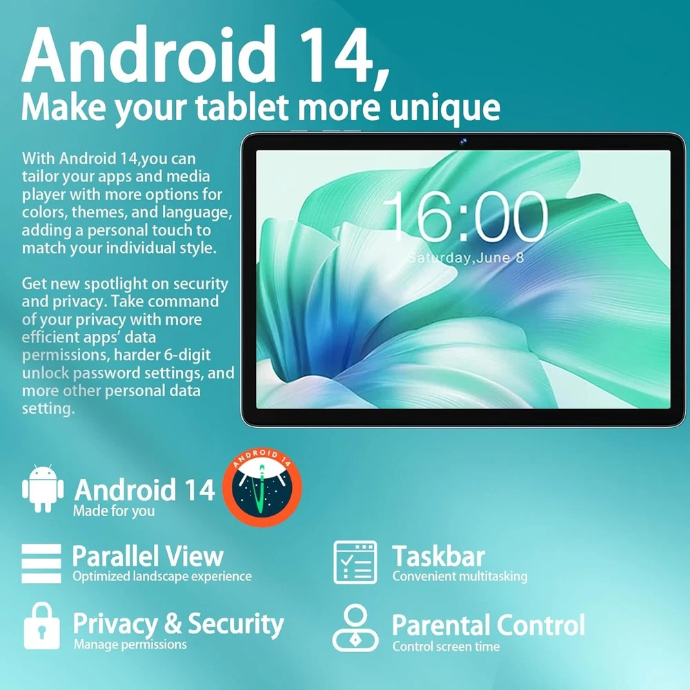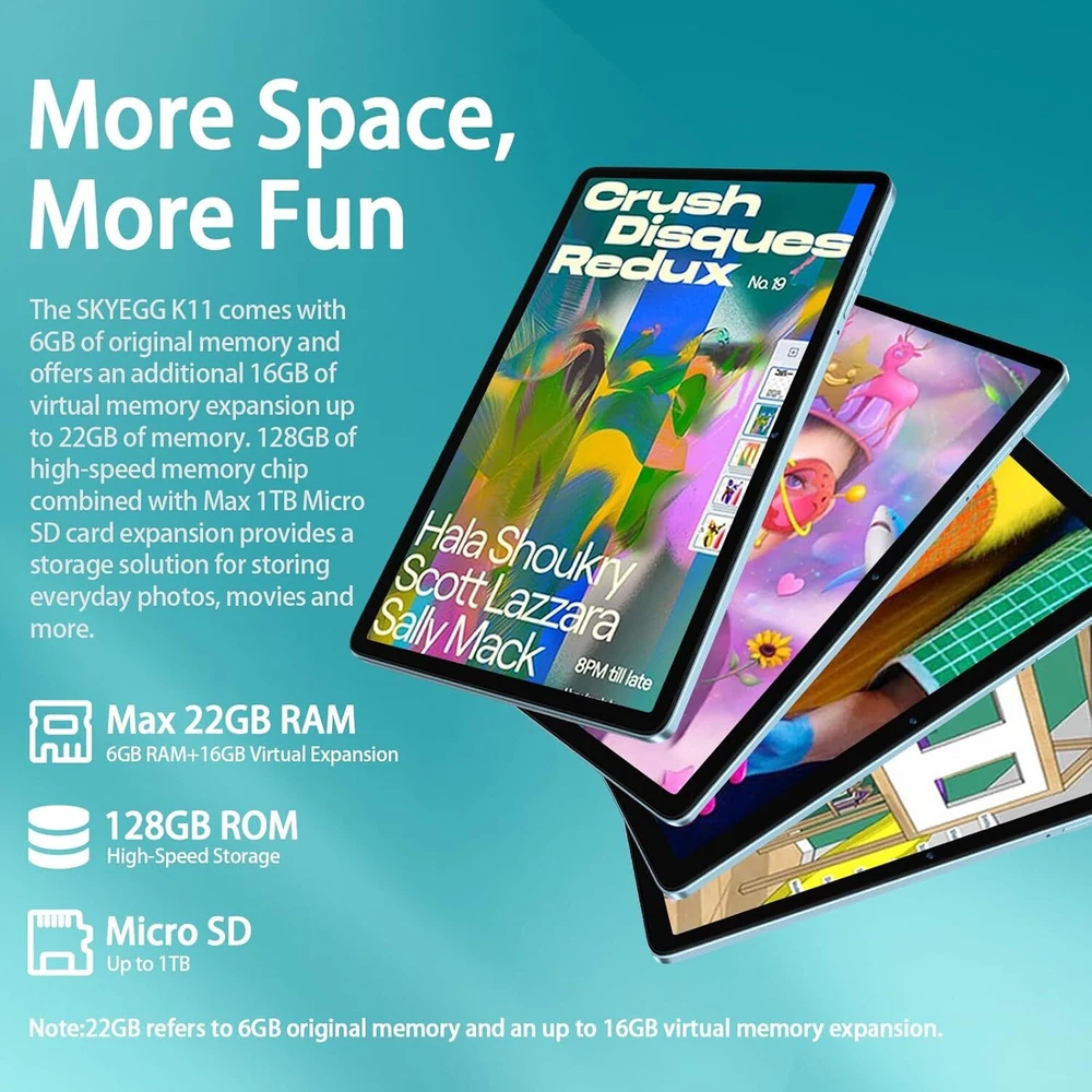 2024 Newest Android 14 Tablet 10 inch Octa-Core Tablets with 22GB Blue Product Details Standing screen display size: 10.1 Inches Screen Resolution: 1280 x 800 pixels Max Screen Resolution: 1280*800 Pixels Processor: 2 GHz Card Description: Dedicated Wireless Type: 802.11ac Brand: SKYEGG Model Name: K11 Memory Storage Capacity: 128 GB Screen Size: 10.1 Inches Display Resolution Maximum: 1280*800 Pixels LATEST ANDROID 14: The K11 Tablet is powered by the powerful Android 14 operating system,which delivers a more personalised,secure and easy-to-use system experience. Enjoy a new taskbar and a friendlier user interface with enhanced customisation options MORE STORAGE: Equipped with 22 GB (6+16 virtual) RAM and 128 GB ROM,the K11 tablet handles large apps and multitasking with ease. Whether you're streaming media or managing large amounts of data,it offers plenty of space and speed to meet all your needs OCTA-CORE PROCESSOR: SKYEGG K11 is powered by the Unisoc T606 octa-core processor with two A75 cores at 2.0 GHz and six power-efficient A55 cores. It not only ensures fast performance for work and play,but also makes it easy to use demanding applications 8000mAh BATTERY: The K11 Tablet Built-in newly upgraded 8000mAh Li-Polymer battery for more careful energy control, standby time and longer usage. With a versatile Type-C port, charging is fast and hassle-free