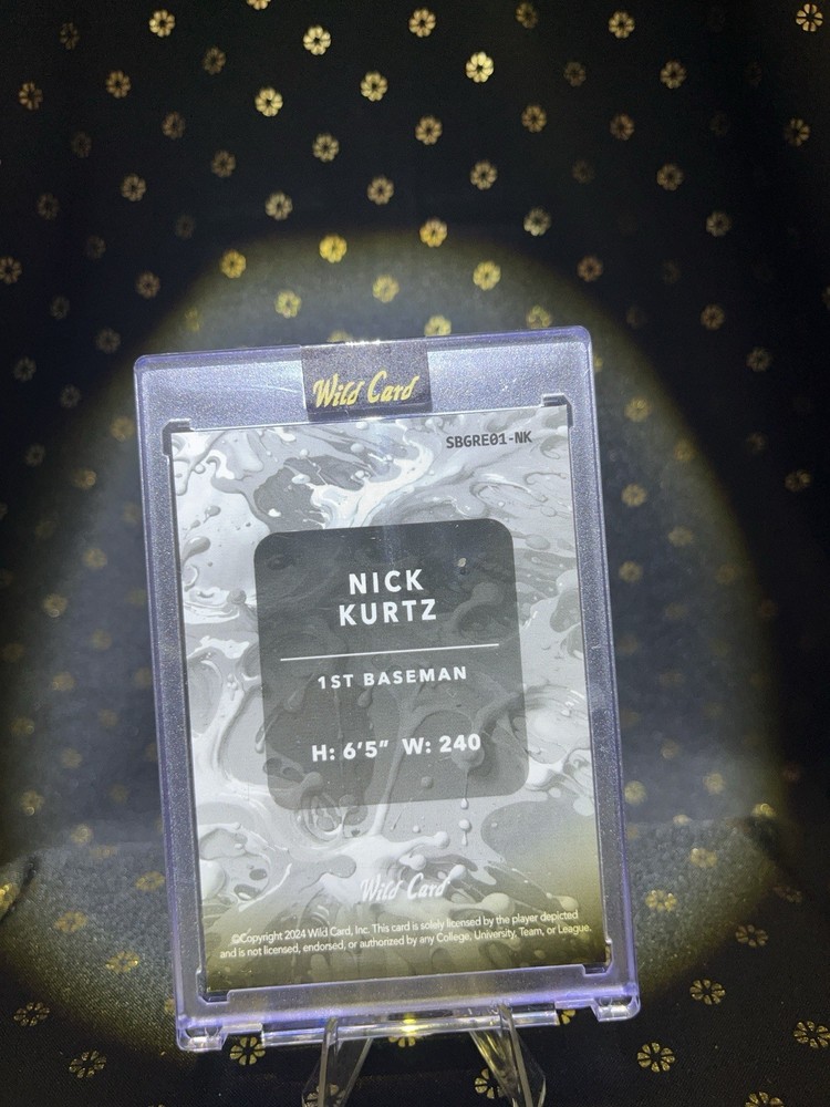 The product is a 2024 Nick Kurtz Wildcard Splat PRC 2/3 Green Cracked Ice sports trading card. Nick Kurtz was the unanimous winner of the 2025 American League (AL) Rookie of the Year award.